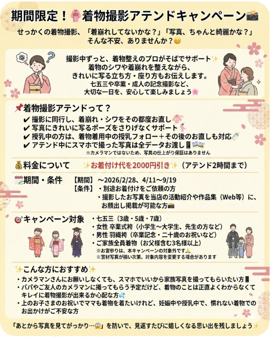 ✔ 撮影に同行し、着崩れ・シワをその都度お直し