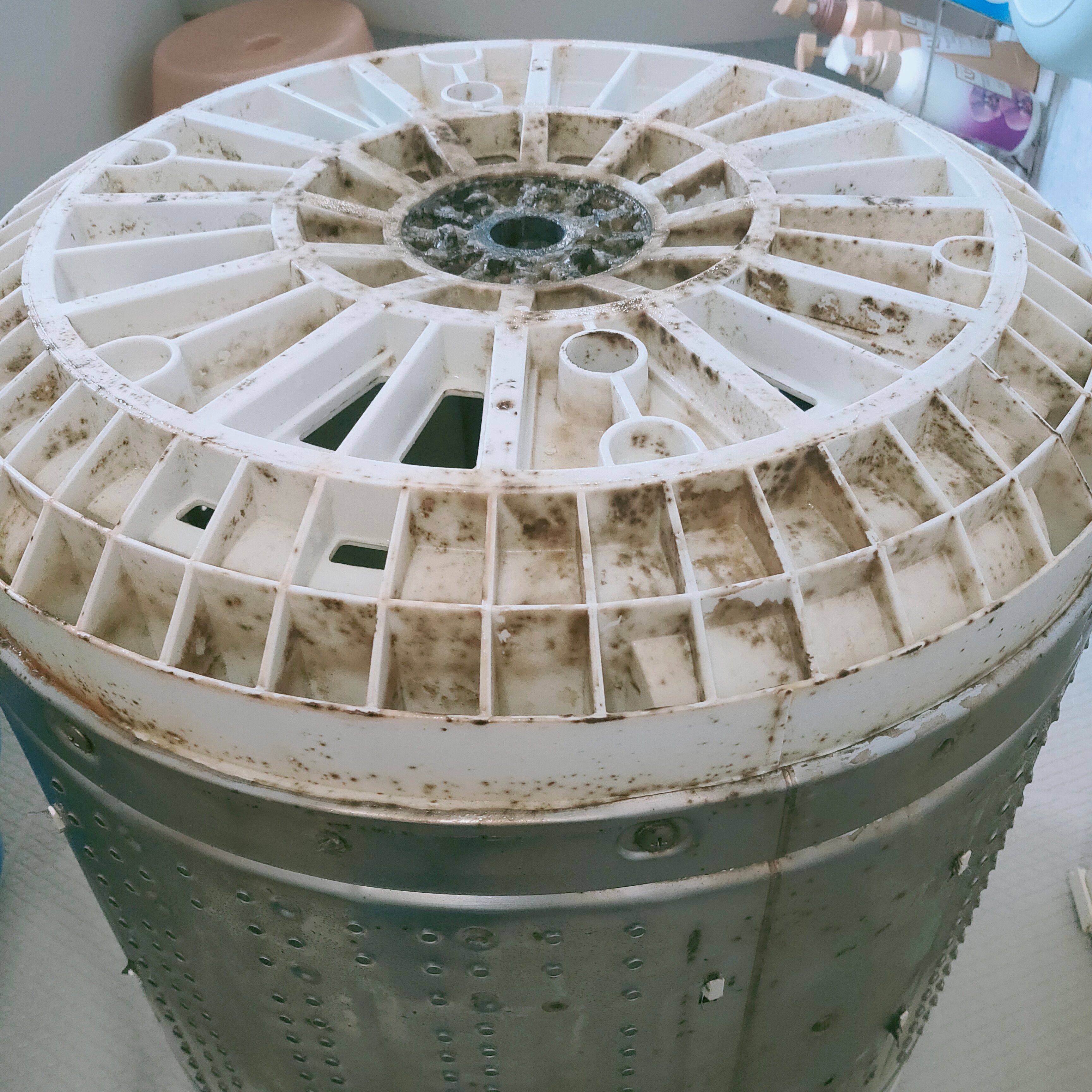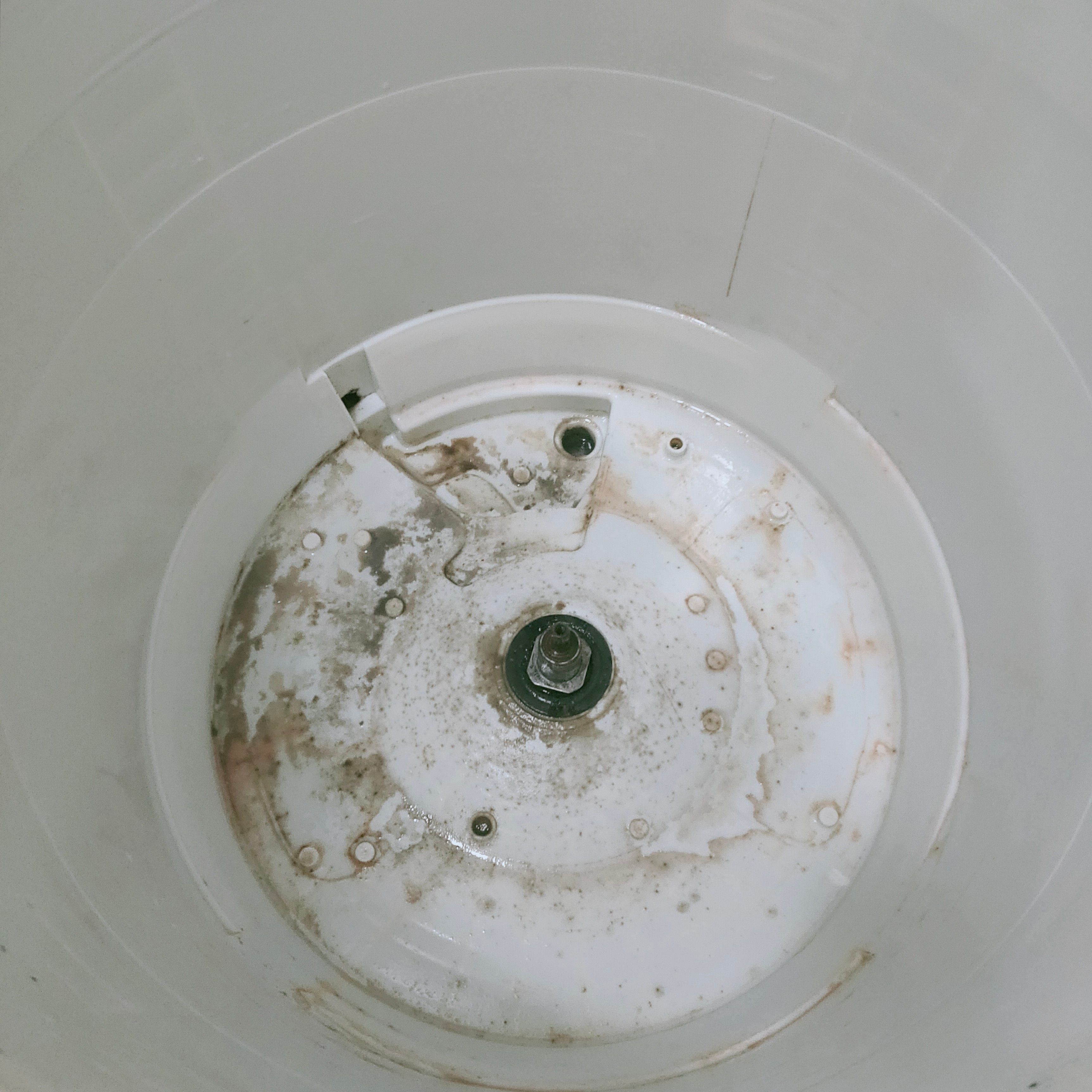 ステンレス槽の裏側はあまり汚れてませんが、パルセーター(攪拌翼)の裏側とステンレス槽の下面は、カビ汚れが多いように感じました。