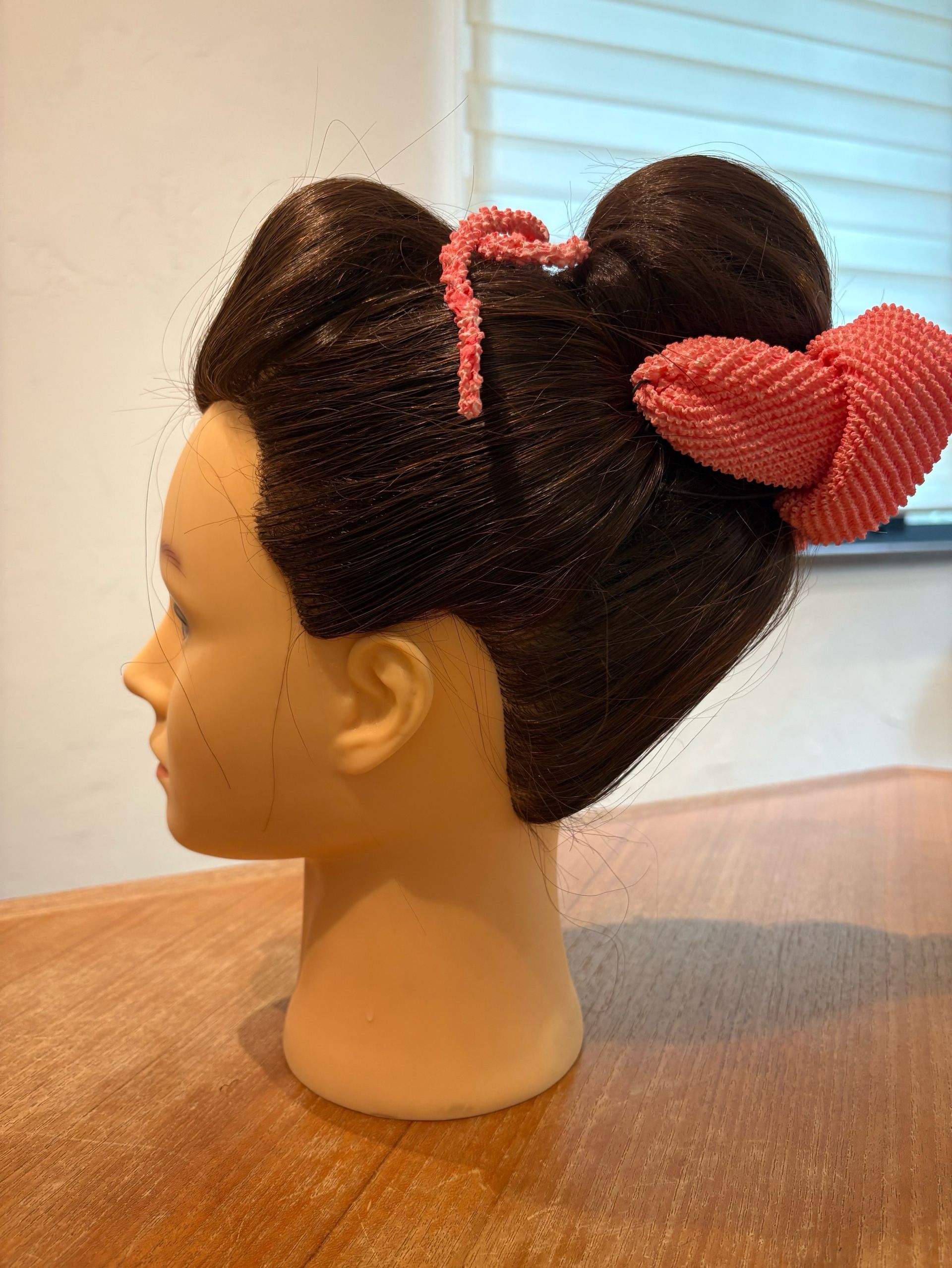 絞りの帯揚げをリメイクして、カノコとチンコロの髪飾りを作りました。