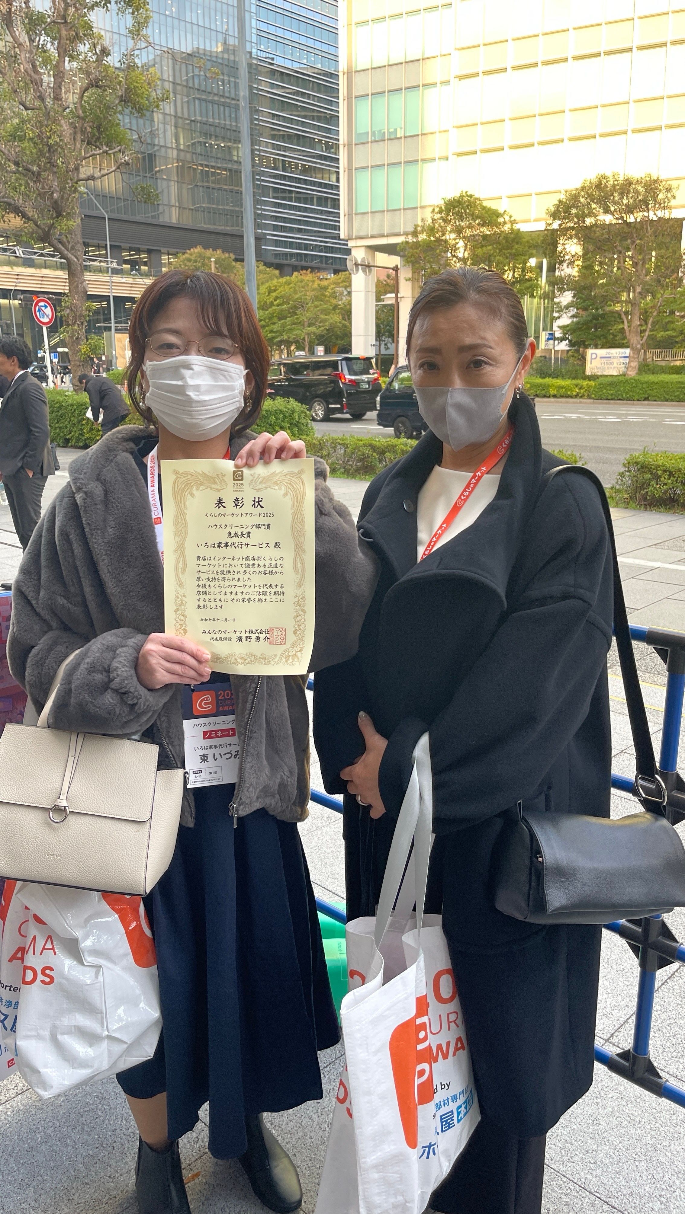 くらしのマーケットアワード2025にて、私たち、いろは家事代行は急成長賞で入選いたしました!たくさんのお客様に支えていただき、感謝いたします。店長東とスタッフ鹿島、会場前にて