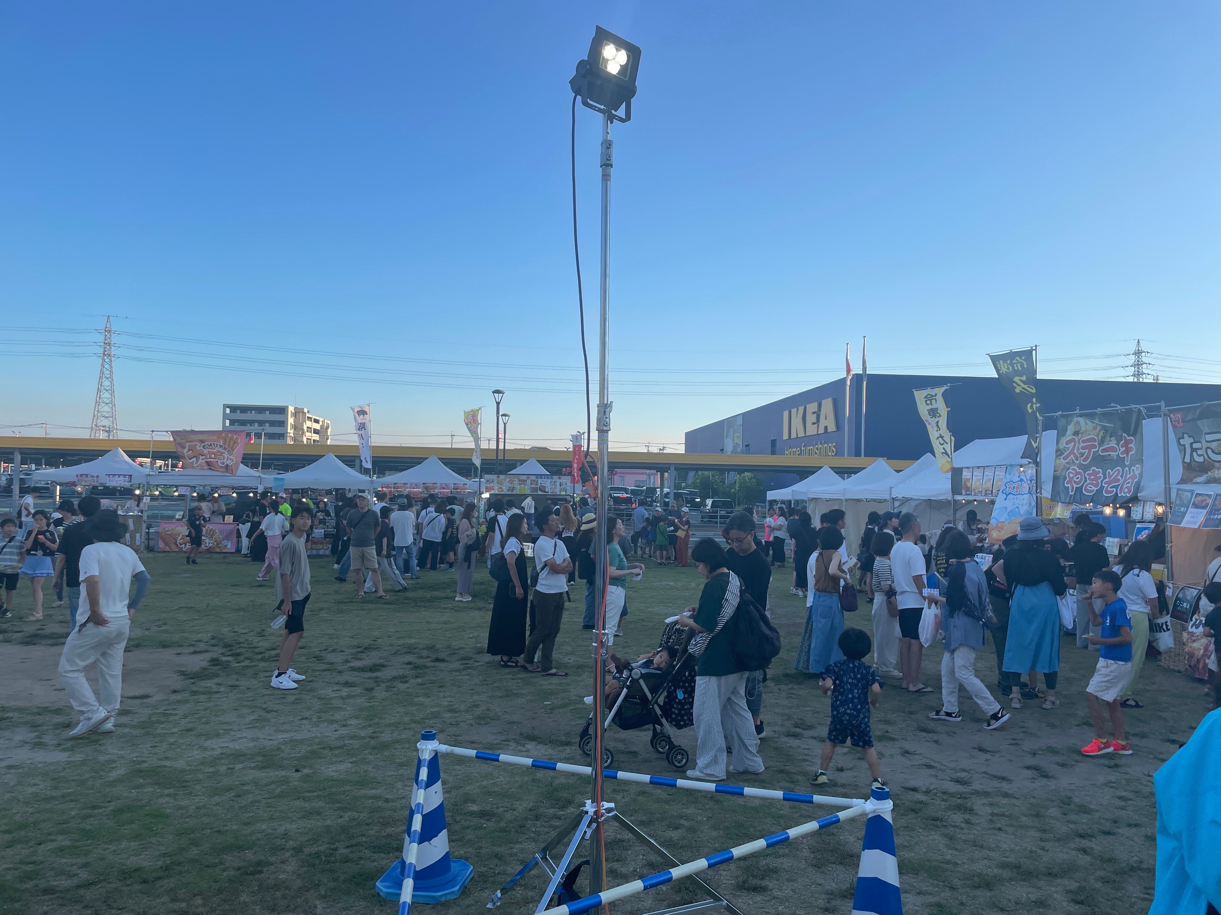 遠くに見えるIKEAの建物と広い駐車場が、都会的な背景と祭りの伝統的な雰囲気を絶妙に融合させていて、地元ならではの風景だと感じました。