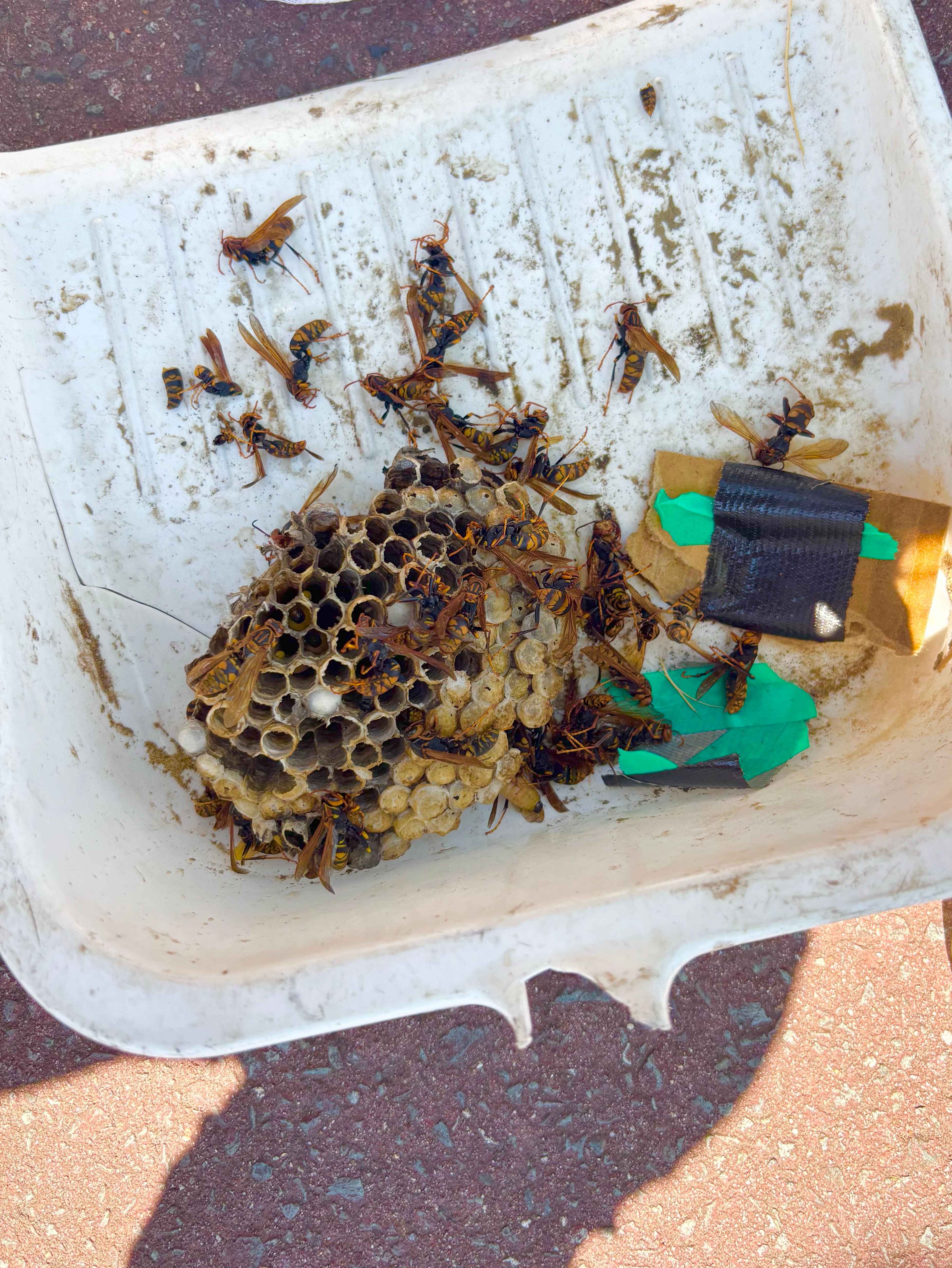 最近はアシナガバチの巣に関するご相談が多く、サイズも大きくなってきているため、発見されやすくなっている傾向にあります。アシナガバチも毒性があり、刺されると腫れや痛みだけでなく、体質によっては重篤なアレルギー症状を引き起こす場合もあります。ご自身での駆除は非常に危険ですので、必ず専門業者にご依頼ください。