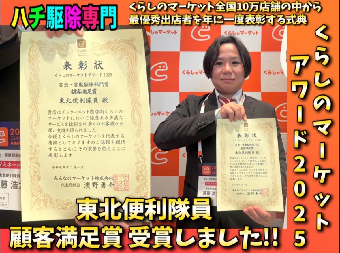 今回の受賞は、ハチ駆除の技術だけでなく、“正直で誠実なサービス”を徹底してきた結果だと感じています。スズメバチ・アシナガバチなど、宮城県のハチ駆除ならおまかせください。危険な巣も迅速に駆除し、安心できる生活環境を取り戻すお手伝いをいたします。