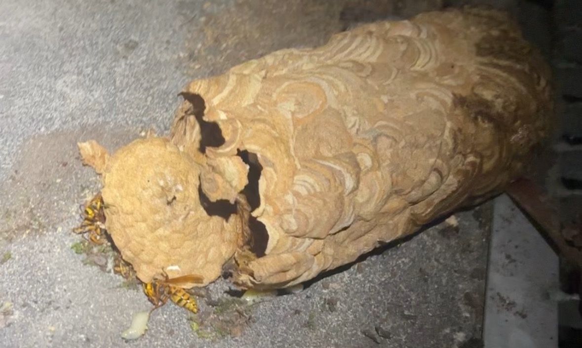 その中でも珍しいケースとして、ブロック塀の穴の中に巣が作られていることがありました。種類はキイロスズメバチで、巣の形を空間に合わせて作ることができるため、ブロック塀の穴に沿って長細い形になっておりました。