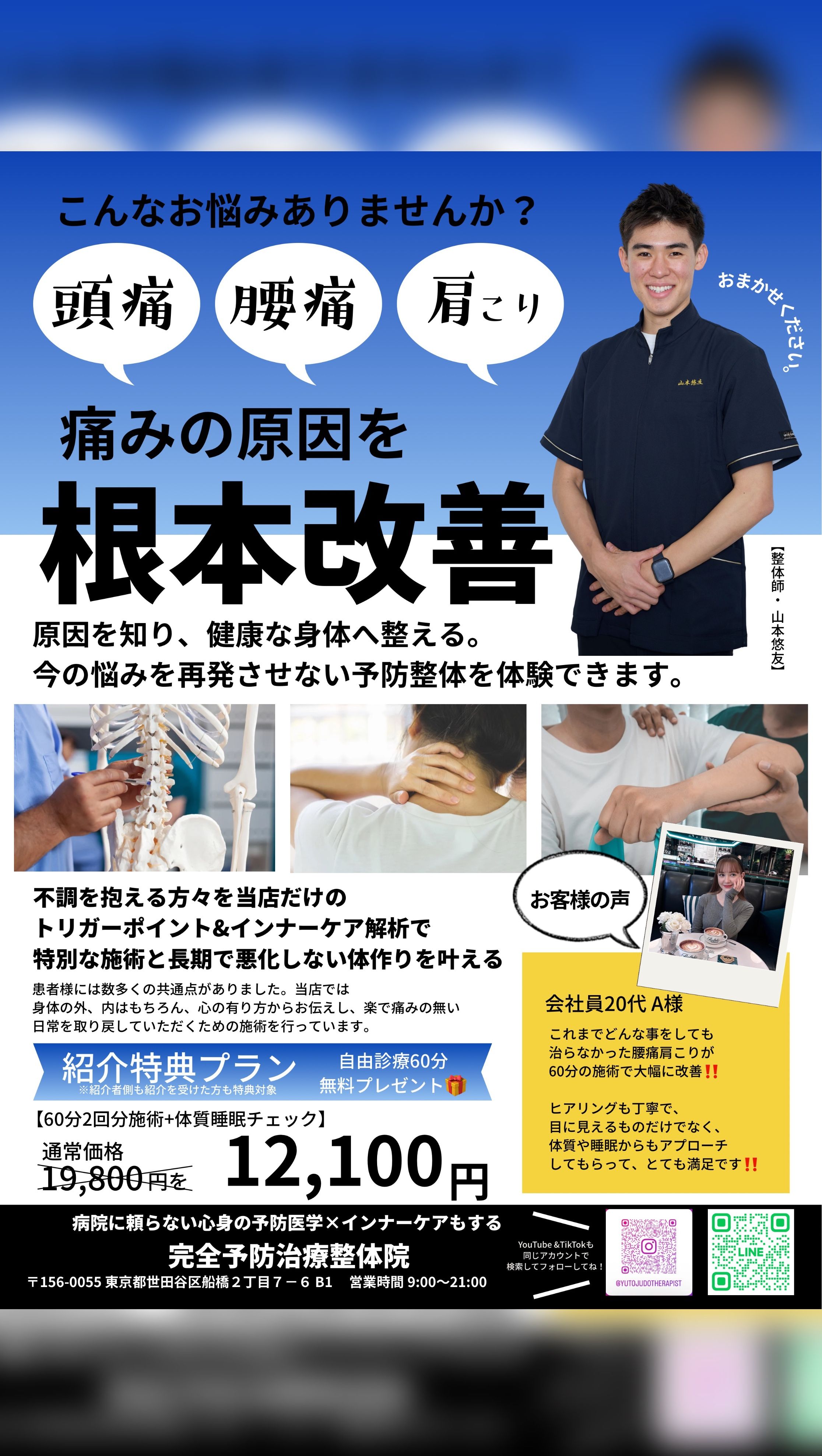 世田谷年間来院数1位を獲得店在籍×3万人以上の施術実績【予防整体×大病予防】本気で改善したい方のみ通えば通うほど安くなる