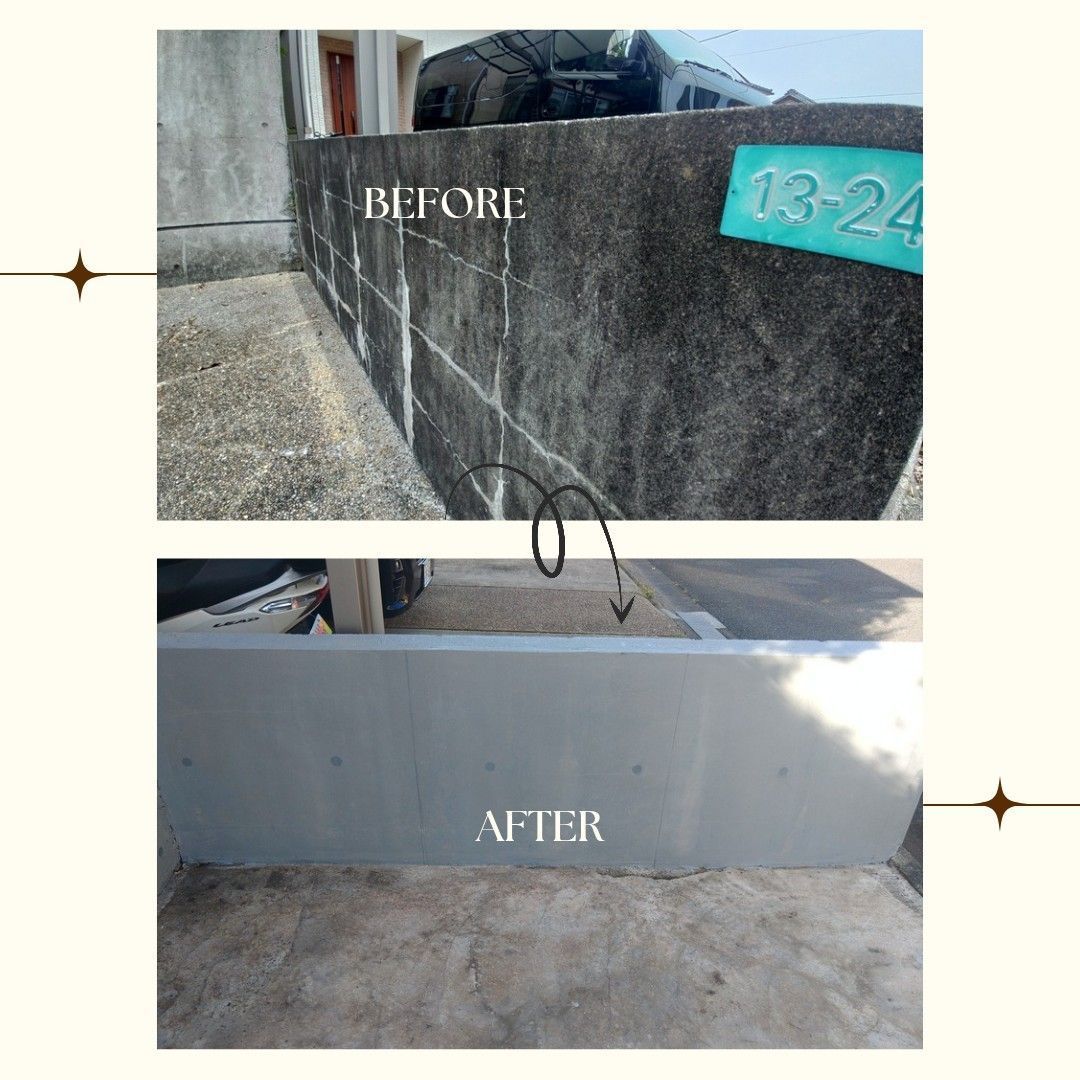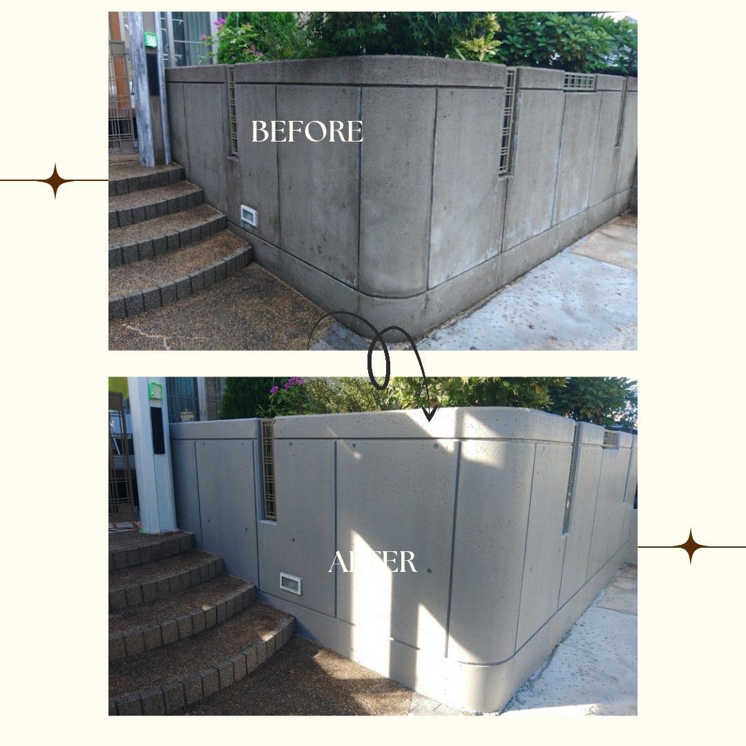 1部ブロック塀だった為、一体感を出す為コンクリートへ。グレー色を重ね塗りし、セパ穴とつなぎ目を手書きして完成となりました。