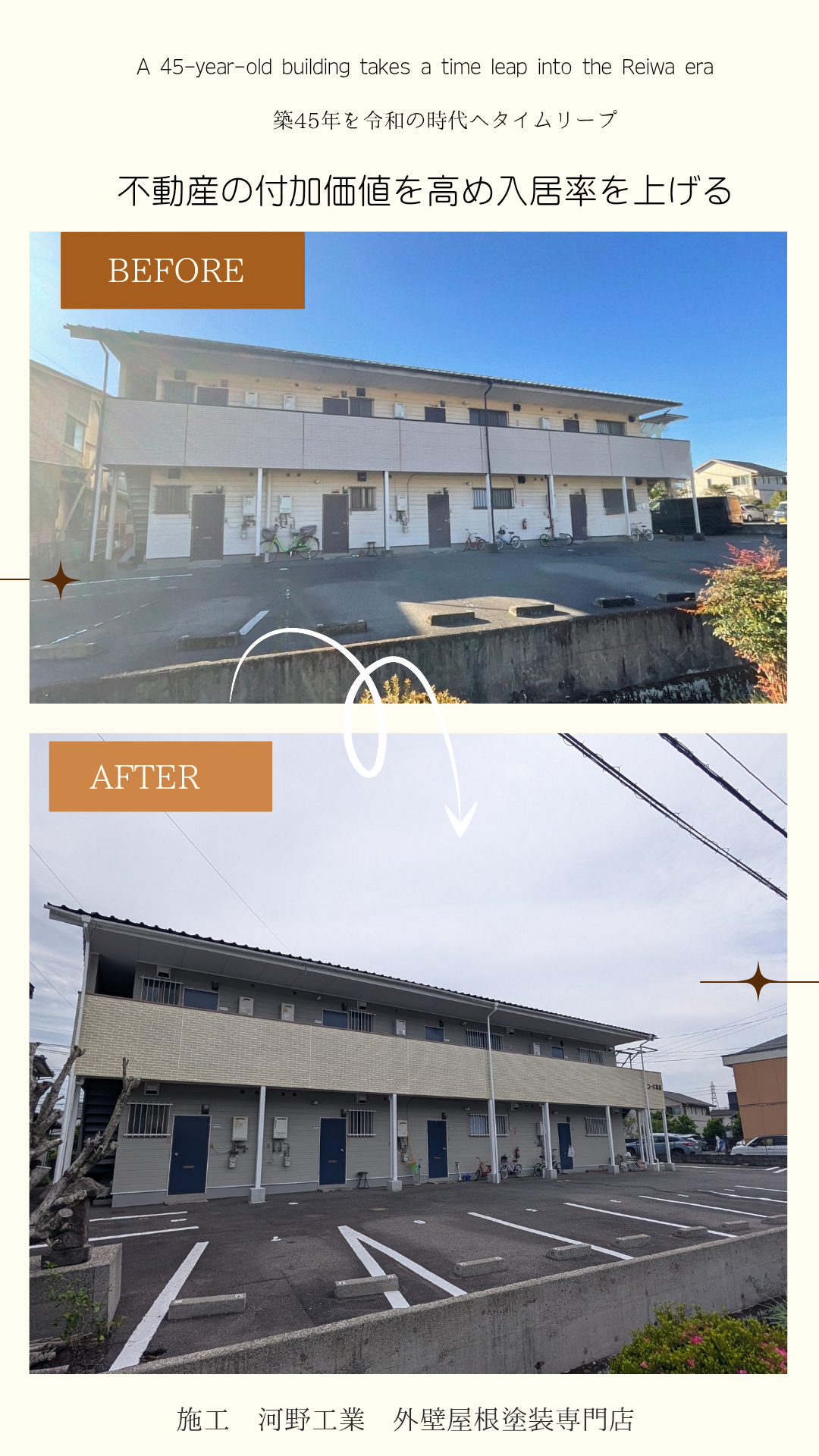 築45年のアパートを令和の現代風にイメージチェンジ。耐久性×デザイン性。入居率を高める為