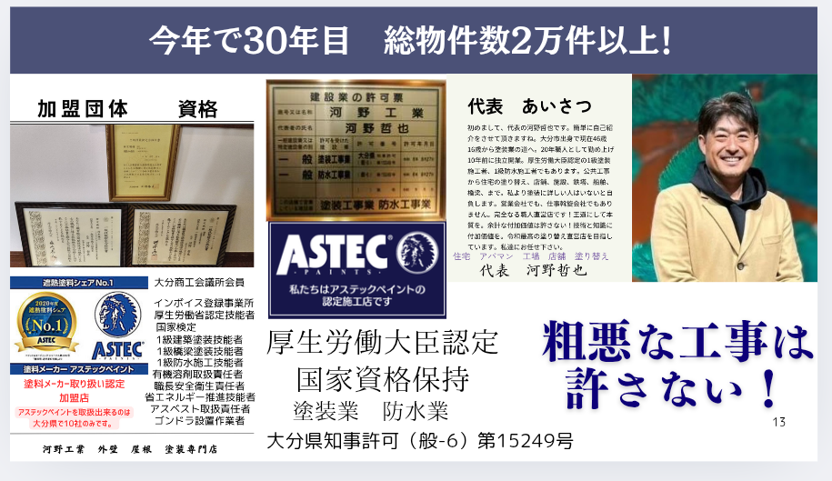 大分市出身 塗装防水工事約30年 公共工事 ハウスメーカー塗り替え多数実績 1級塗装1級防水施工技能士 建設業許可