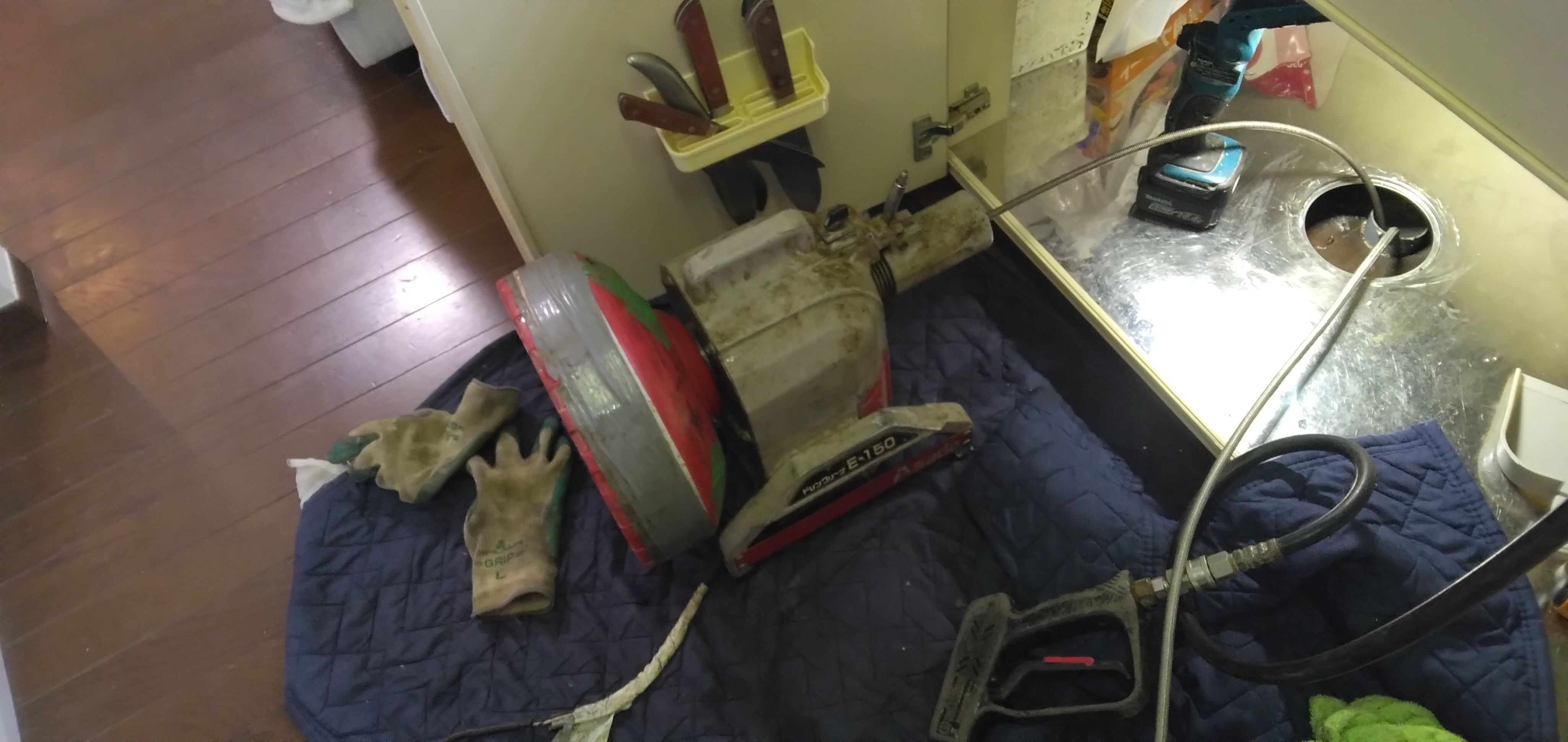 そこで、水を使わない道具。ドレンクリーナーというワイヤーを管に挿入する機械を使いました。高圧洗浄と両方併せて使うことで、詰まり解消しました。