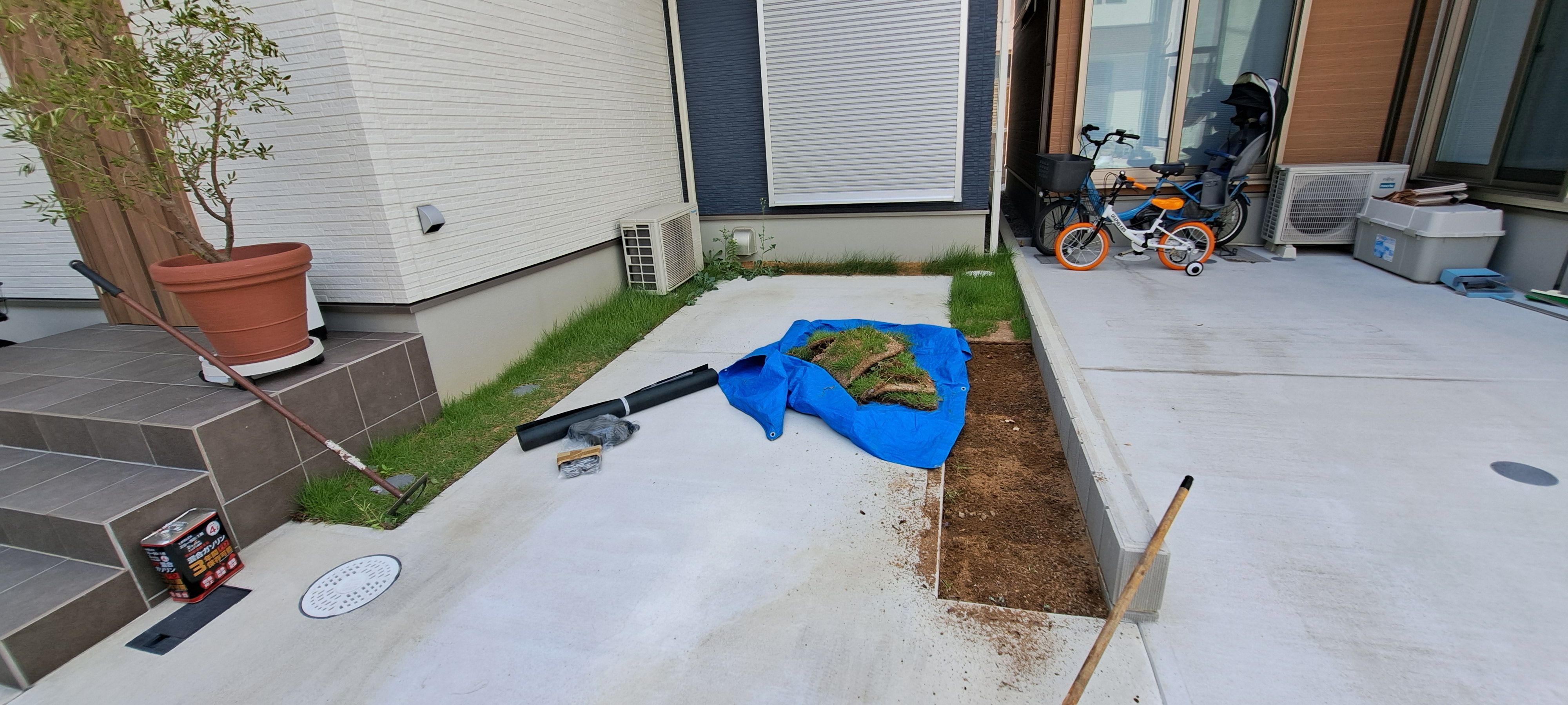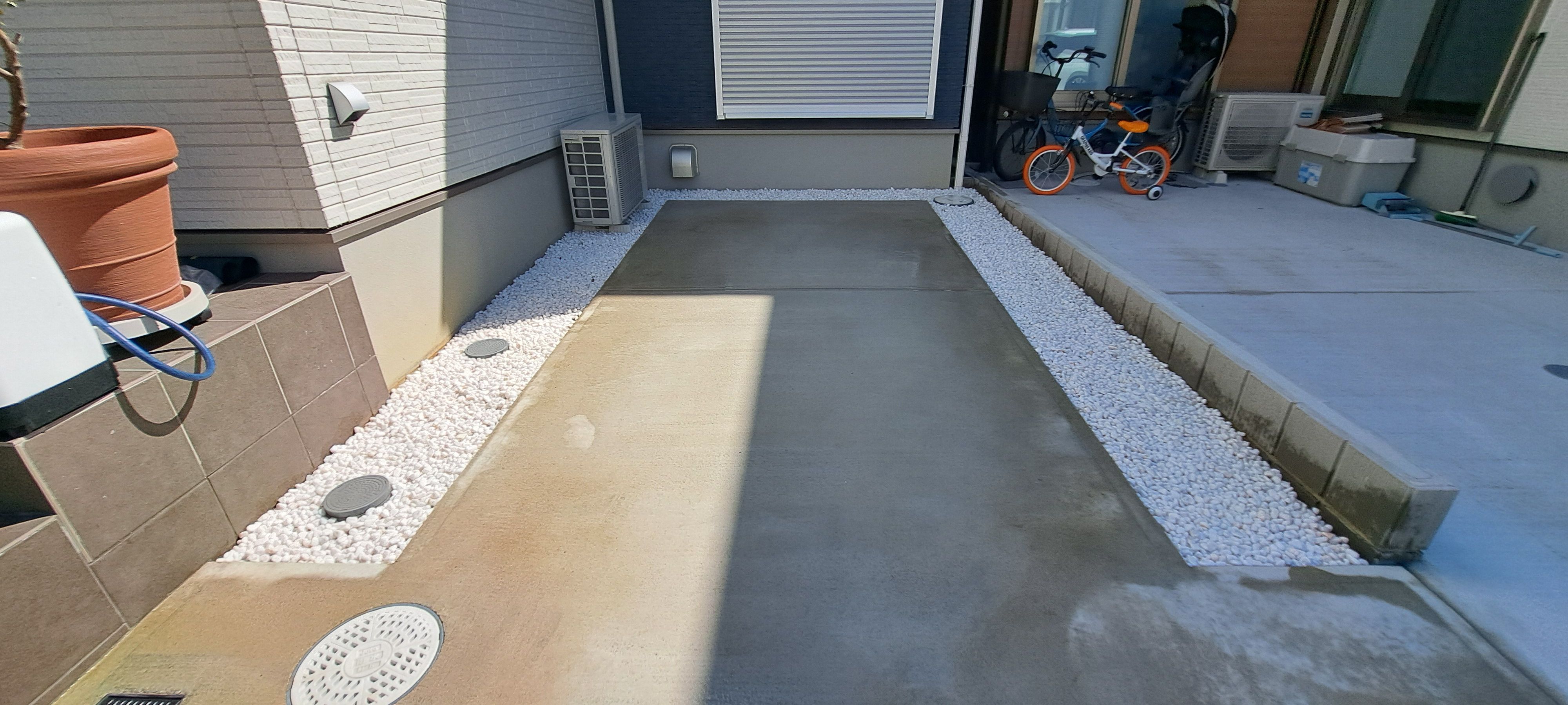 今回は芝で敷き詰められたガレージのスリットを全撤去にして防草シートと白玉石の砂利敷きのサービスをご利用頂きました。砕石も綺麗ですがお家の個性を出すには化粧石は最適ですね😀今回はお客様のご要望で角のない白い石が御好みとのことで白玉石としました👍良い感じに完成致しました👍