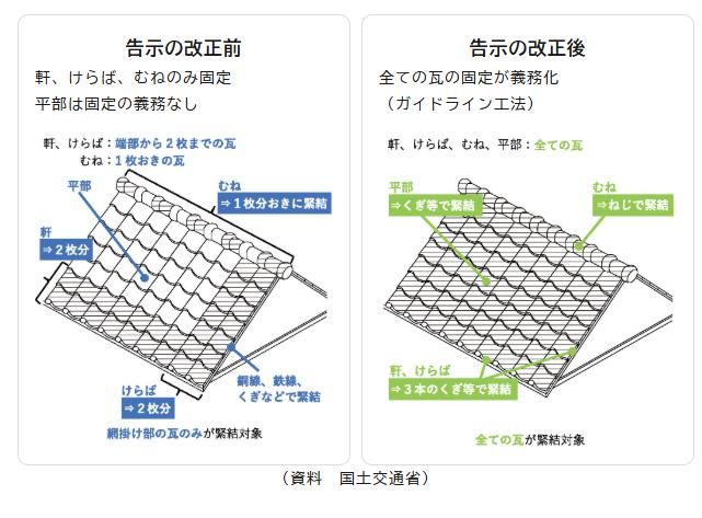 昨今の台風や地震による大規模な瓦の被害を踏まえ、建築基準法の告示基準が改正され、新築の住宅や建築物に対しては、令和4年(2022年)1月から瓦の留付け方法に関する基準が強化され、全ての瓦の固定が義務化されています。