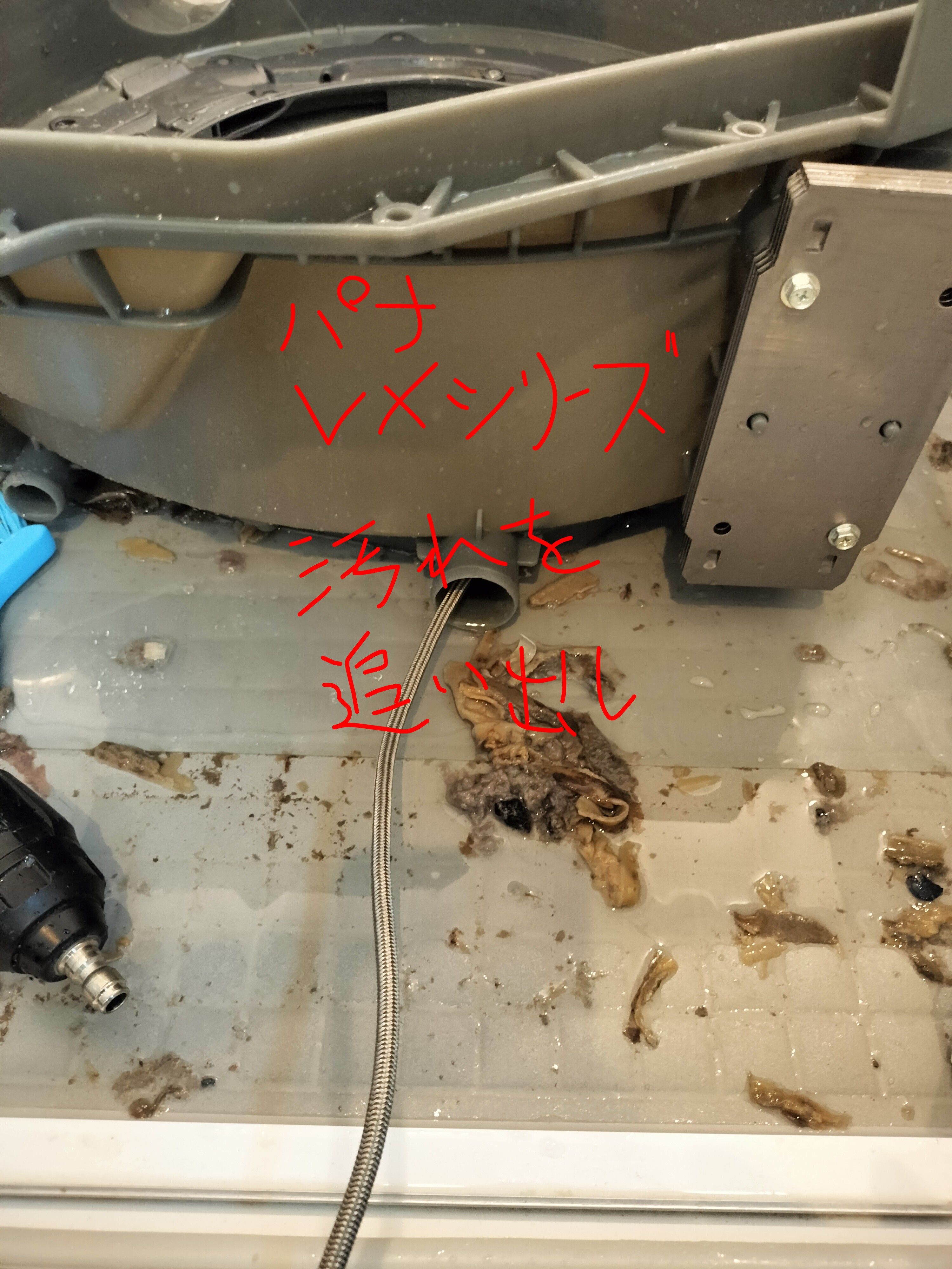 パナソニックドラム式洗濯機 VXシリーズの脱水受けカバーの水経路内部の汚れを排管洗浄の要領で高圧洗浄で汚れを掻き出し。かなり出ました。