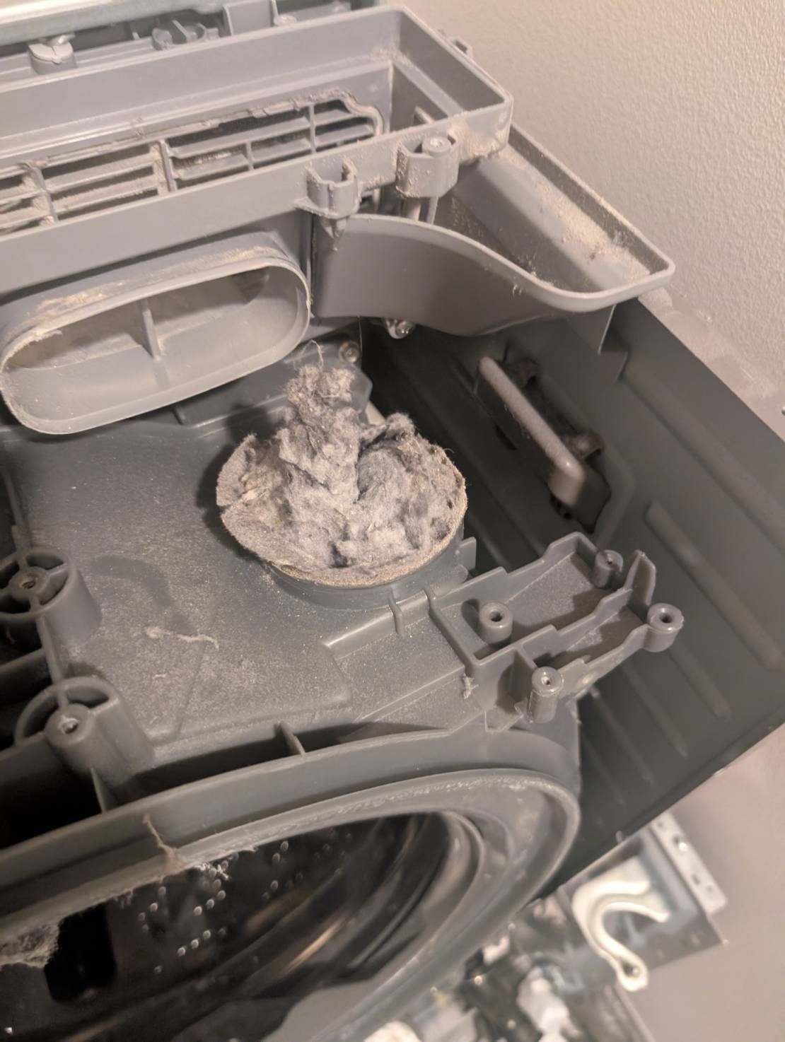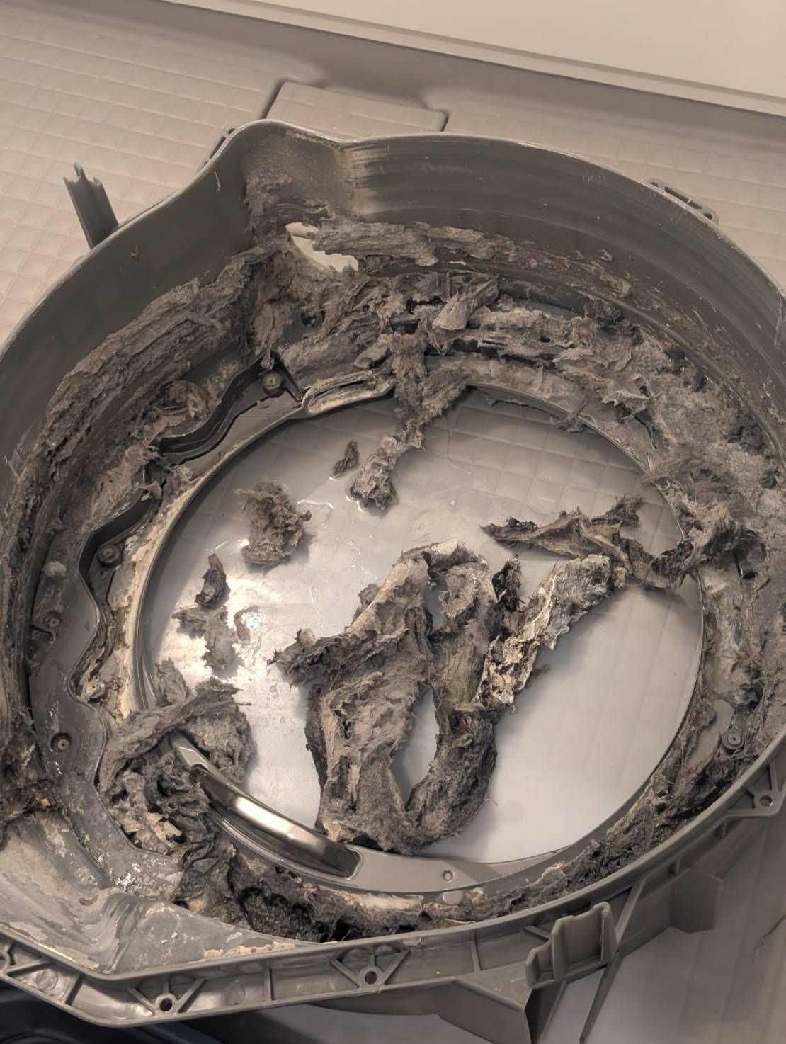 乾燥経路に衣類からのホコリ、脱水受けカバーの内側にも大量のホコリ、汚れ。