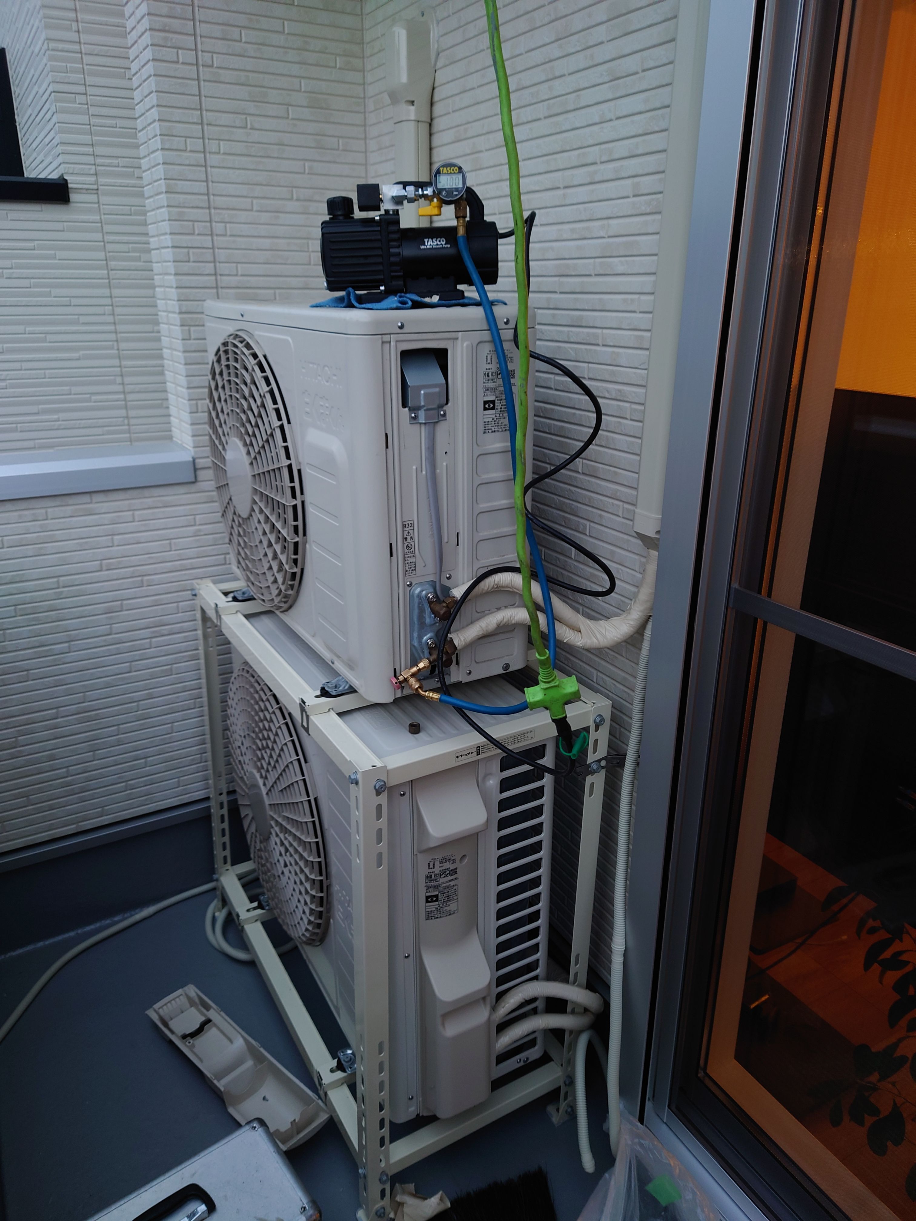 2階と3階の室内機に対し、室外機を2階ベランダに2段置きで設置という、