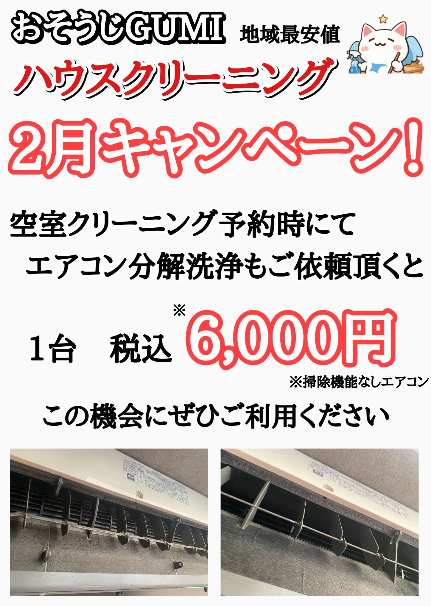 2月中に空室クリーニングをご予約された方に掃除機能なしエアコン内部高圧洗浄を1台6,000円にてご案内しております!