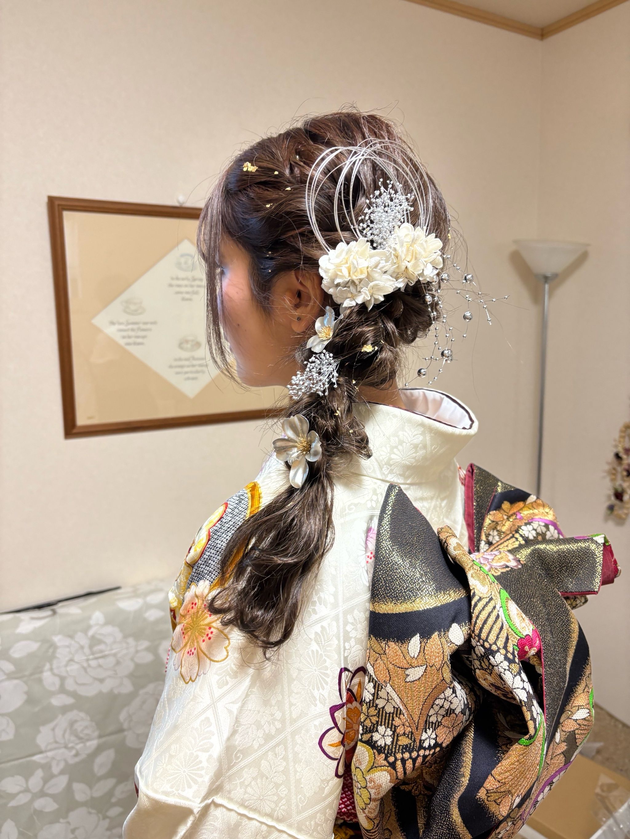今年は、彼女のように、三つ編みなどで片側に流し、たくさんのお花をつける髪型のお嬢様がたくさんいらっしゃいました。