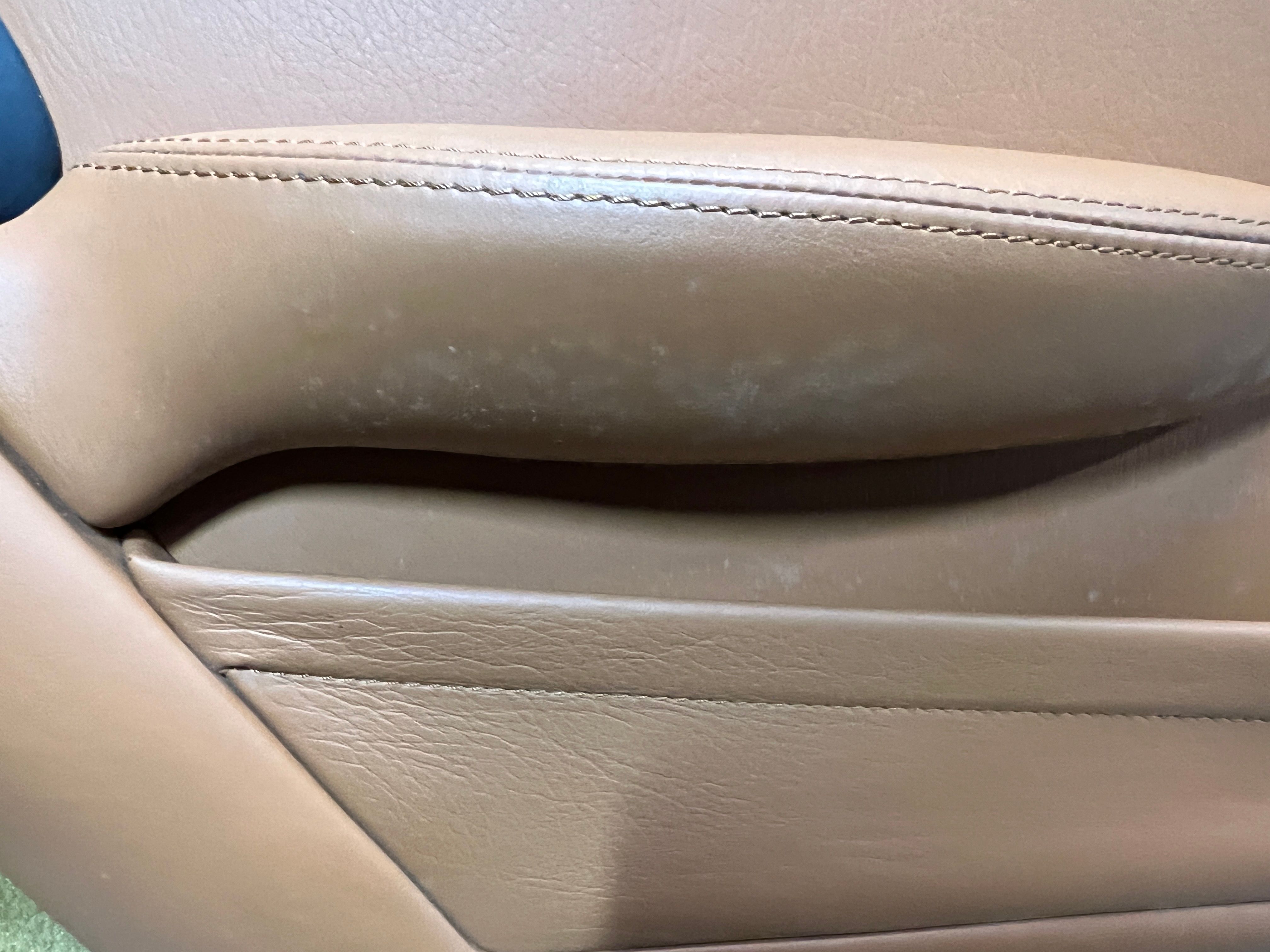 この年式の車両であれば、ある程度量産モデルとしての均質化も図られていると思われますが、この個体は皮革表面に本来あるはずの抗菌成分が、何らかの理由で消失してしまった状態なのではないかと思われます。