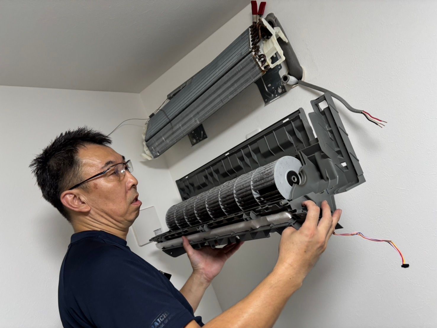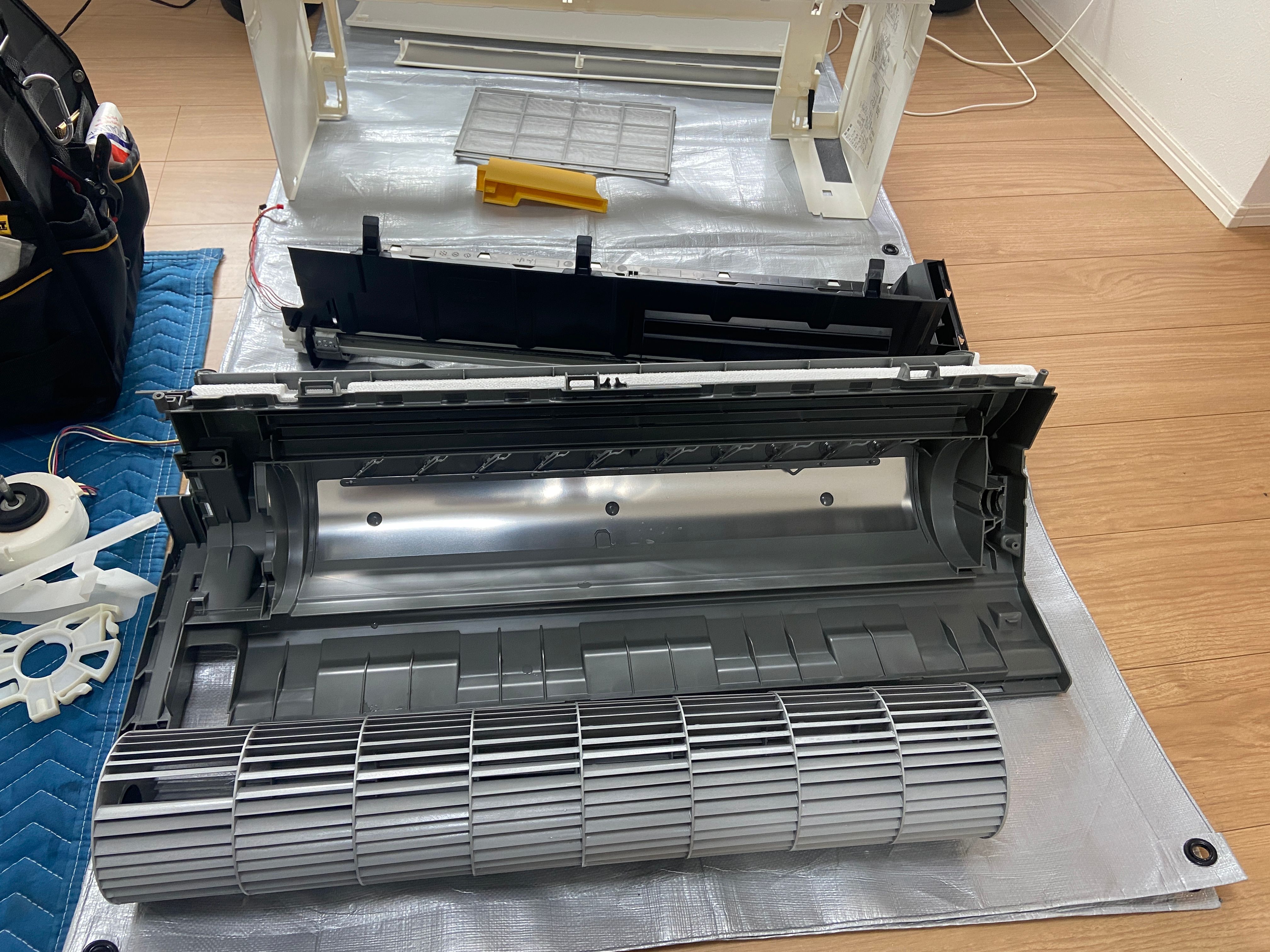 日立製エアコン RAS-YX28K の完全分解クリーニング(背抜き)を実施しました。