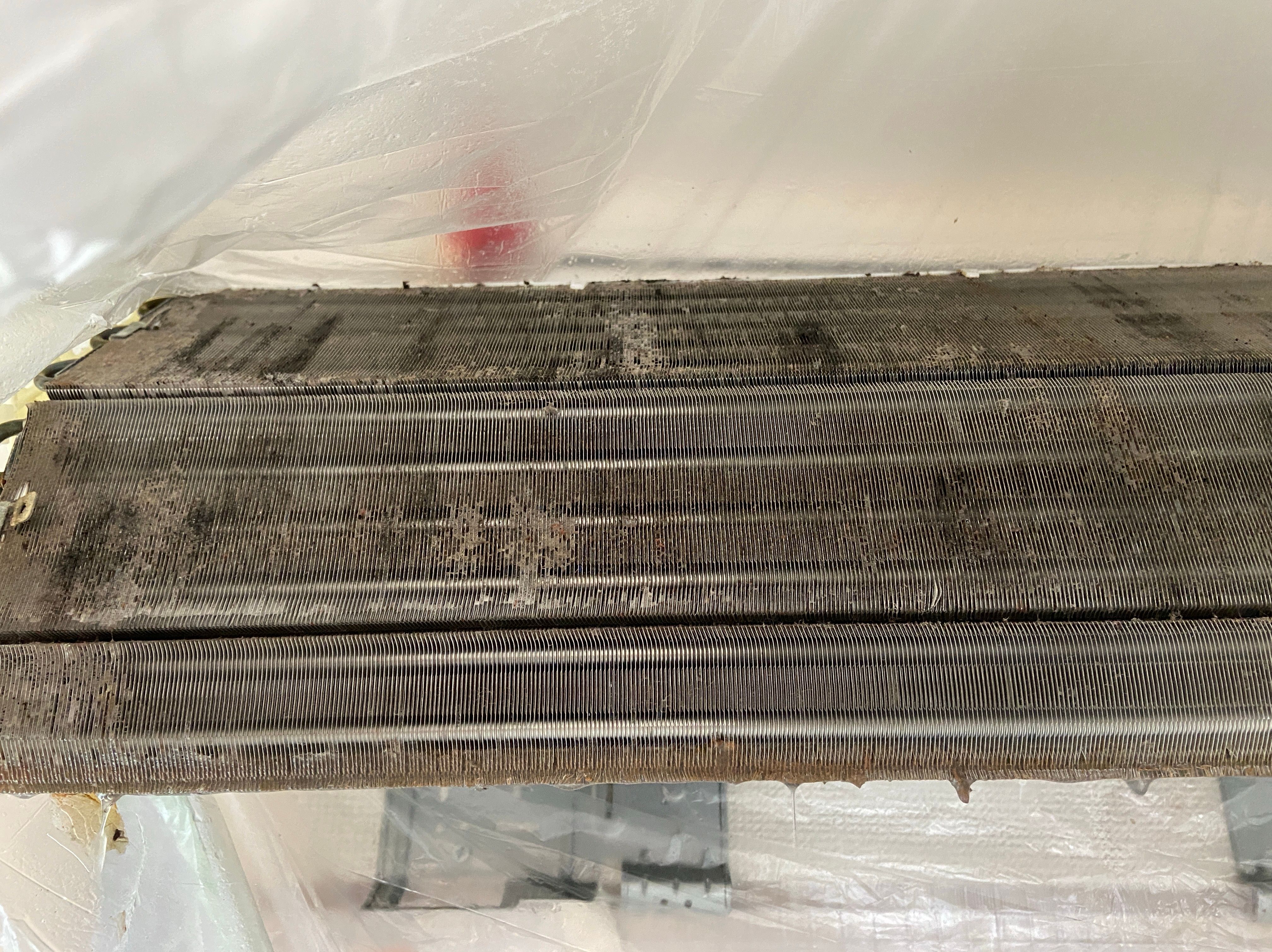 高圧洗浄で熱交換器の奥のカビやホコリを徹底的に除去しました。