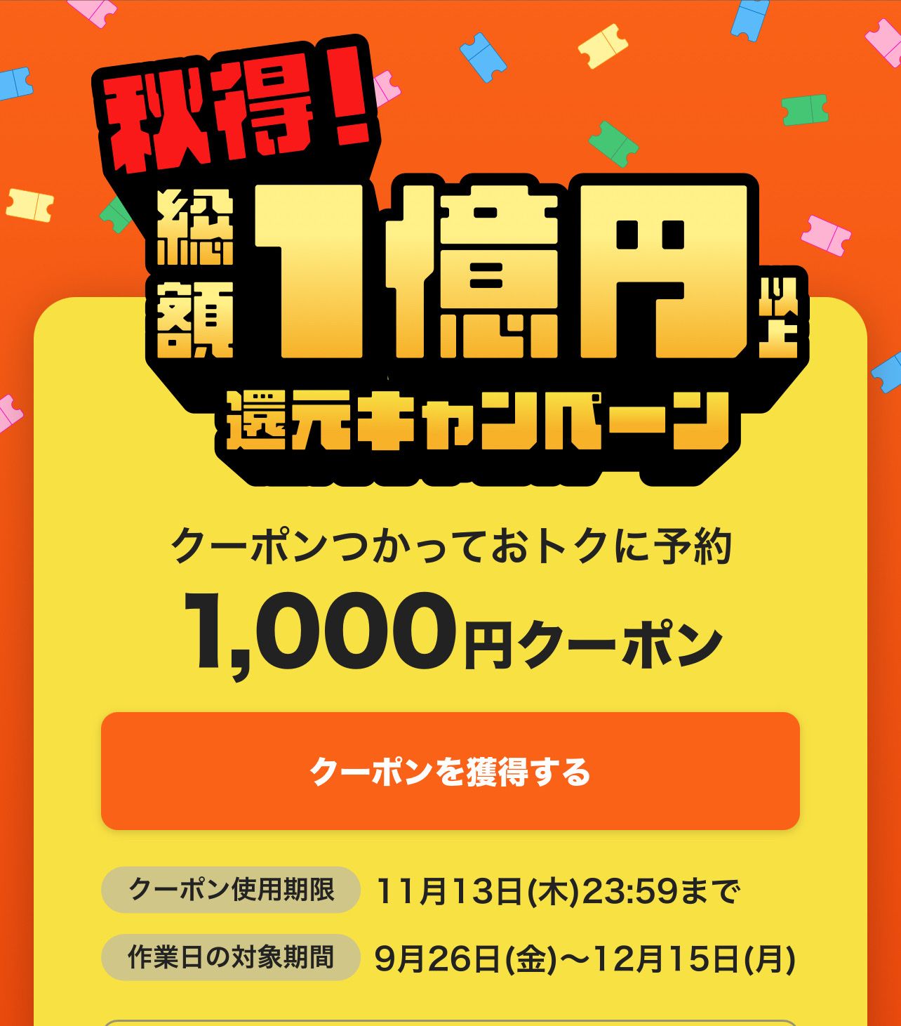 このたび「くらしのマーケット」では、秋の特別企画として 総額1億円以上還元キャンペーン がスタートしました!