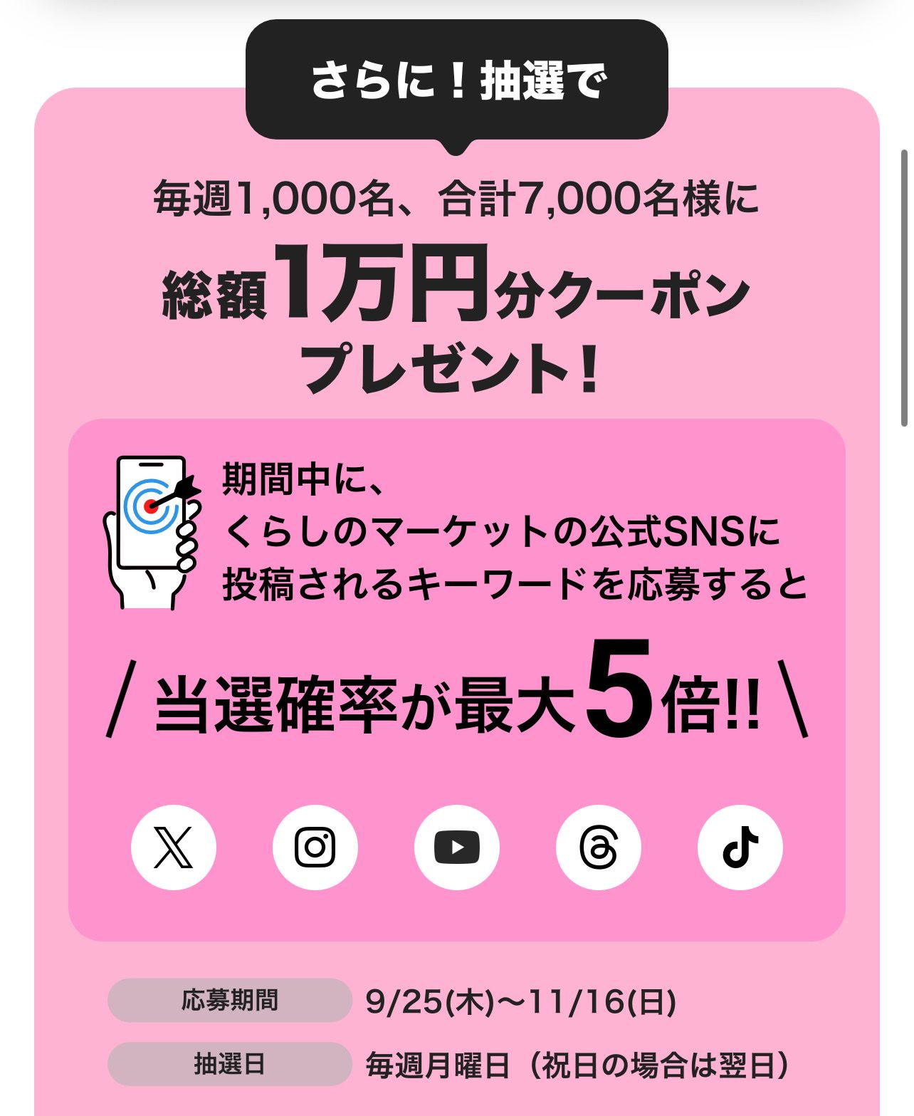 • 1万円分のクーポン が抽選で毎週1,000名様に当たる!(合計7,000名様)