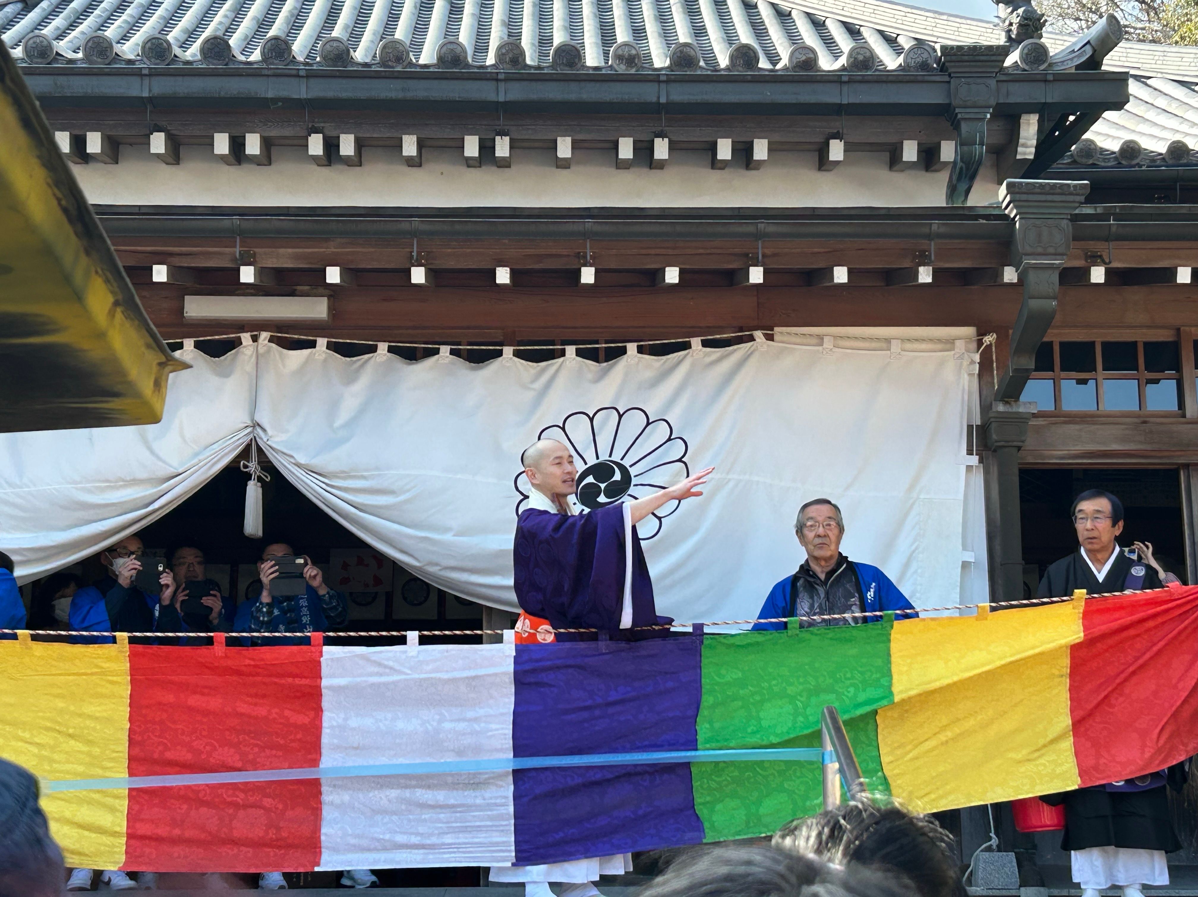 法衣姿のご住職が高い場所から
