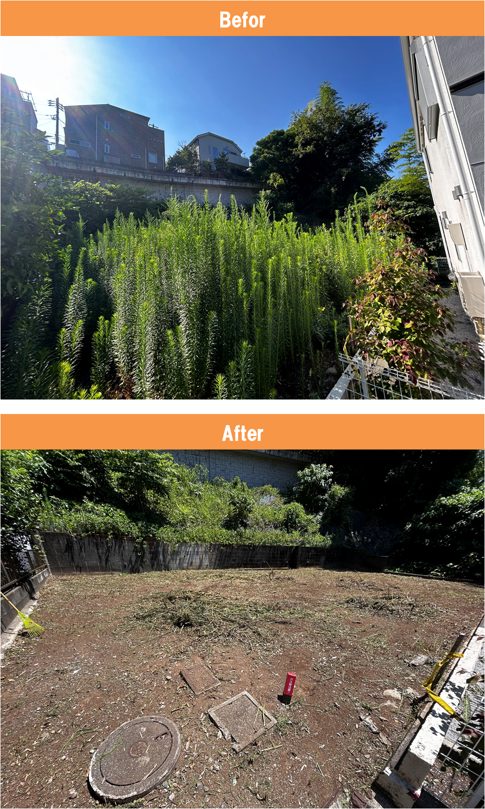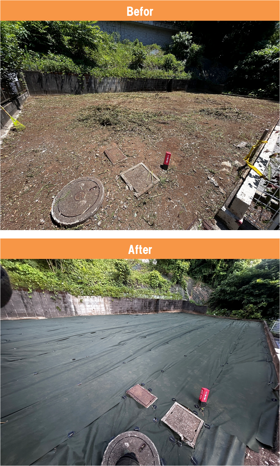 防草シートはご予算に合わせて中間グレードのものを採用、どうしても除去できない茎と多くの石に苦戦しましたが無事施工完了。