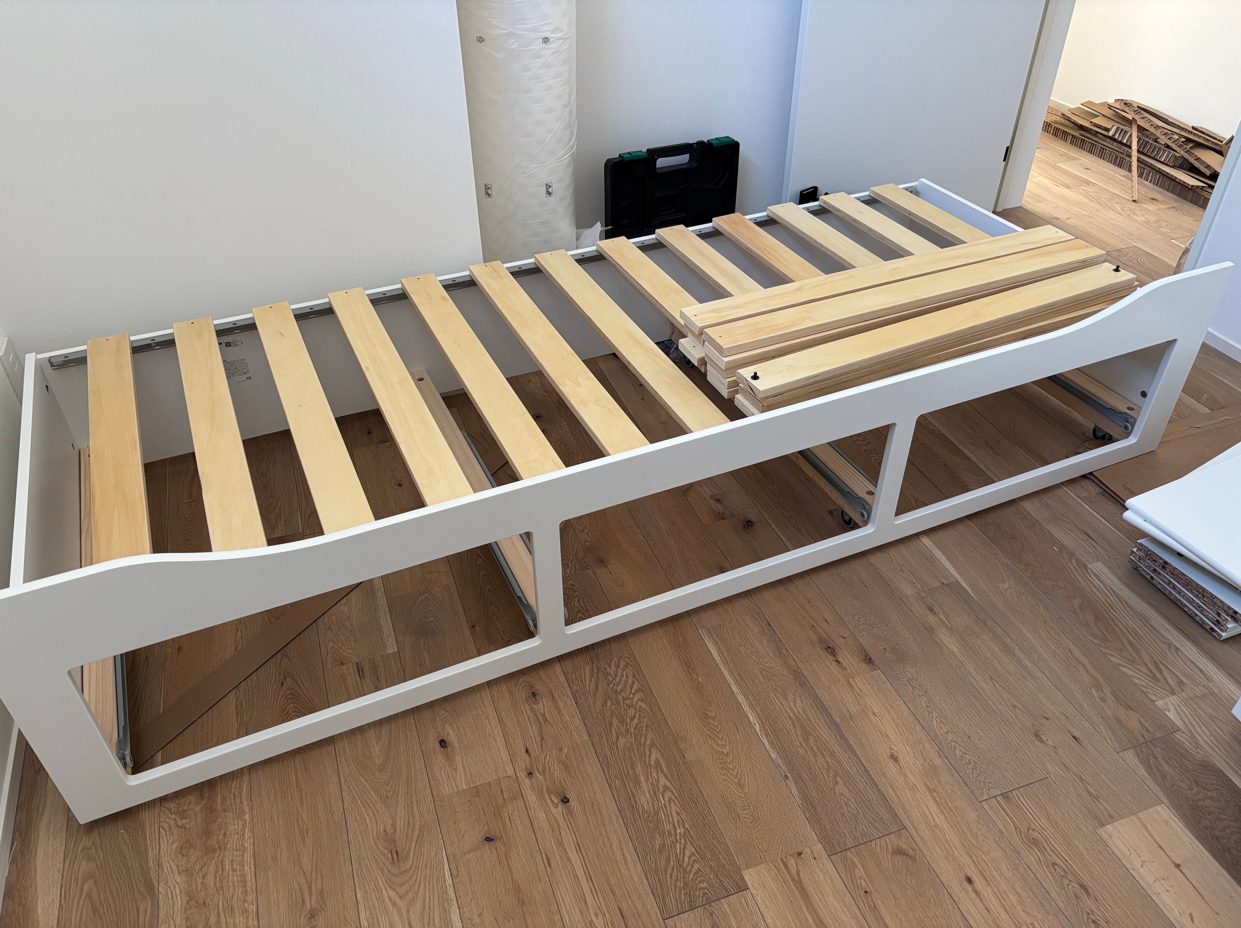 材料の板材のほとんどが1枚ものなので、ベッド長手方向の部材は背丈ほどあるので、壁などにぶつけない様に注意が必要です。