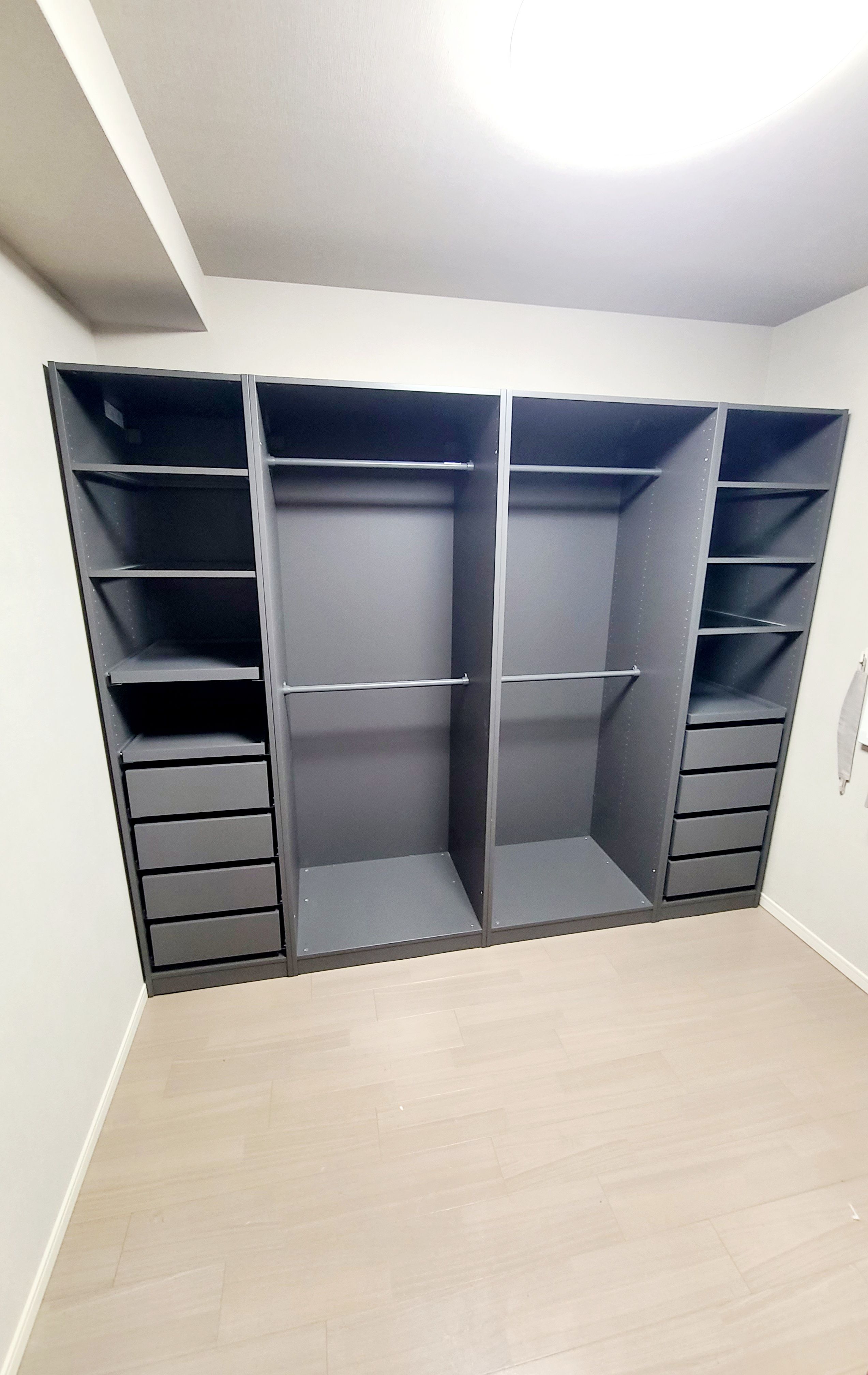 ハイタイプ 大容量のワードロープを組み立てしました 部屋の幅とほぼ同じサイズでした。転倒防止も設置しました