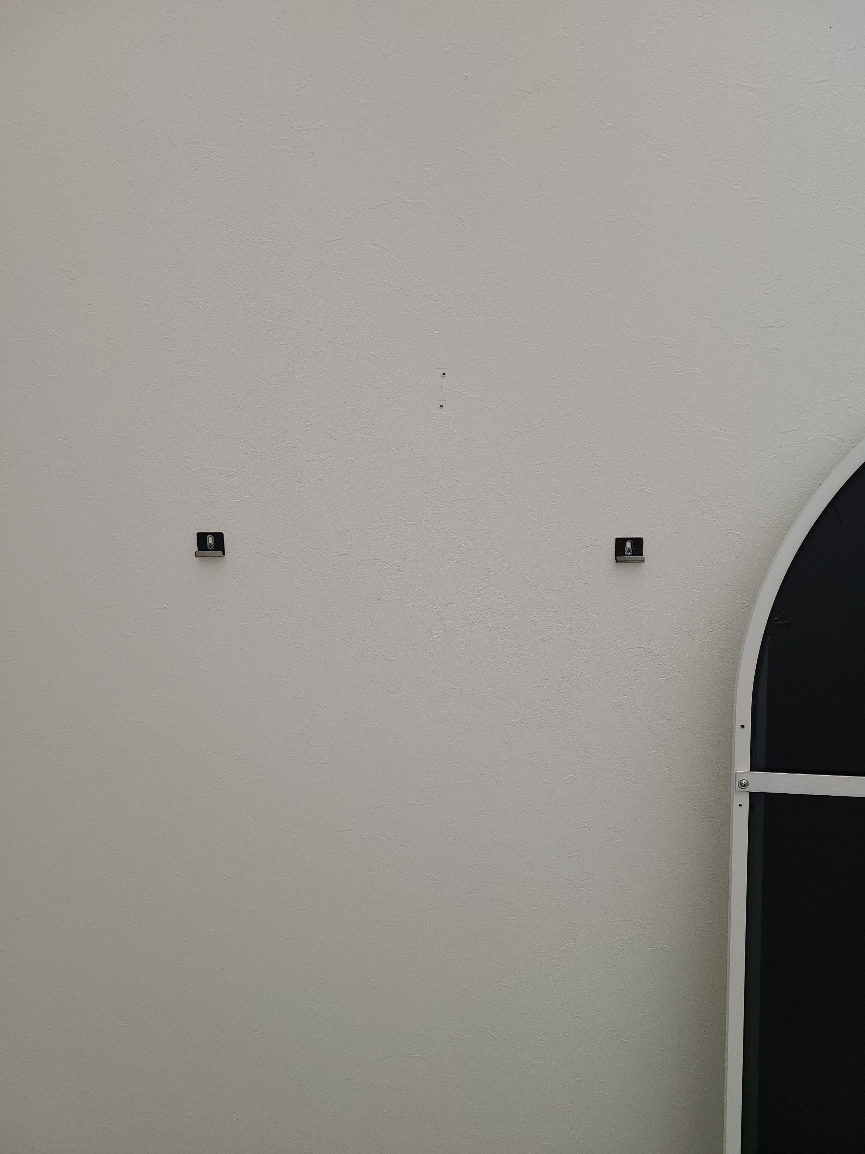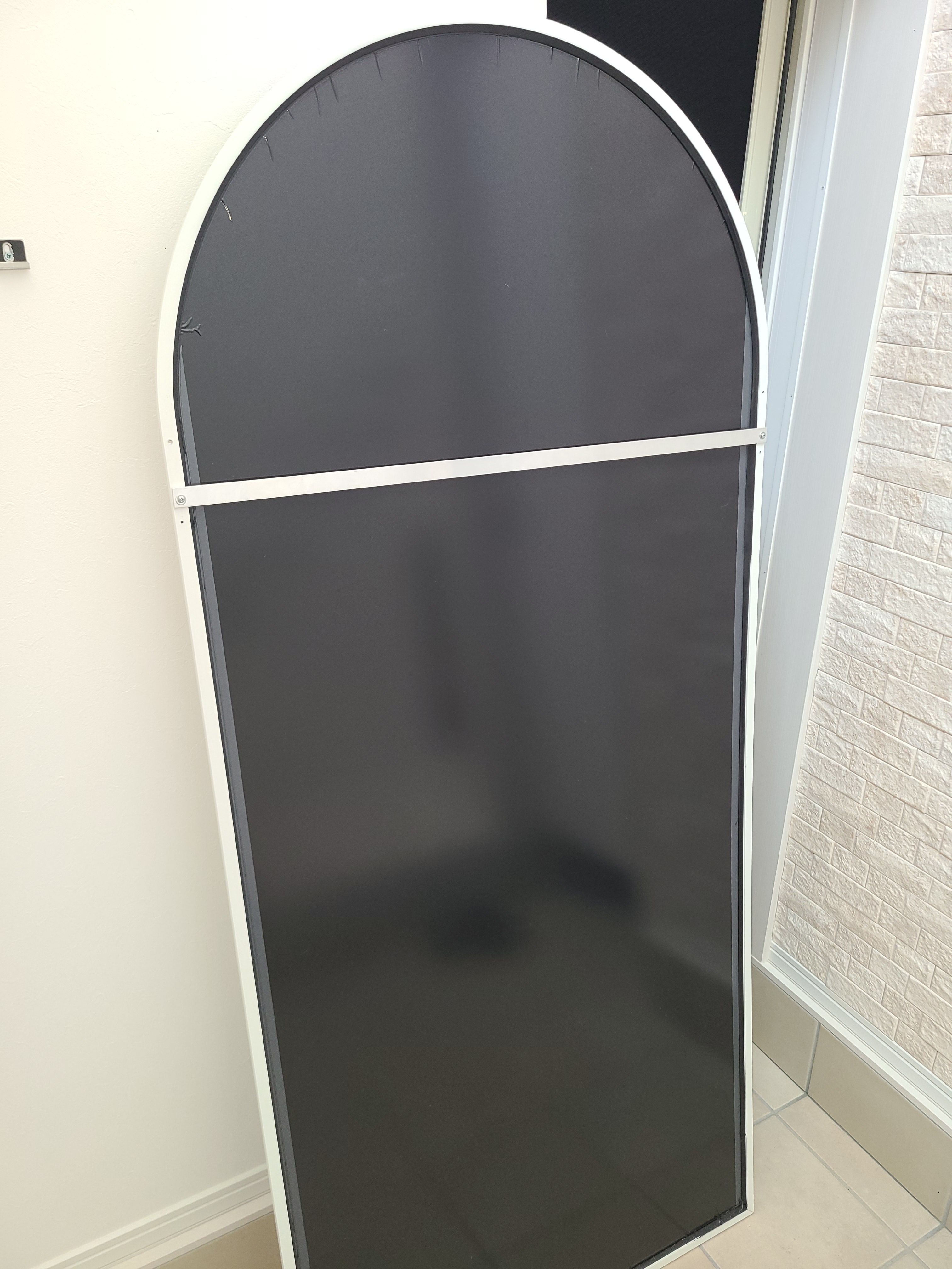ミラー据え置きタイプを壁に掛けれるかの相談があり 平たいアルミ板を背面にビス止めして 鏡用の金物で壁に掛けました
