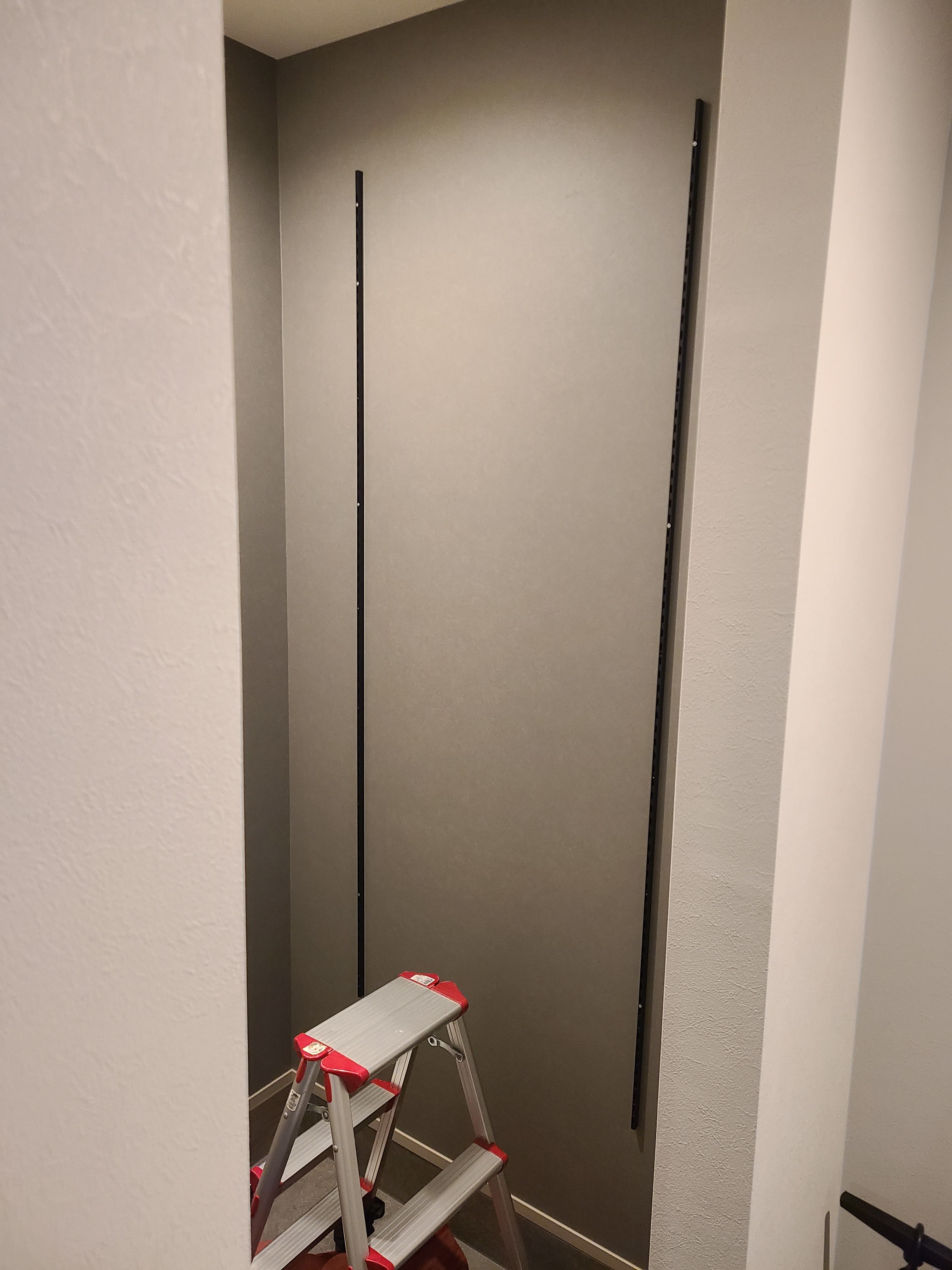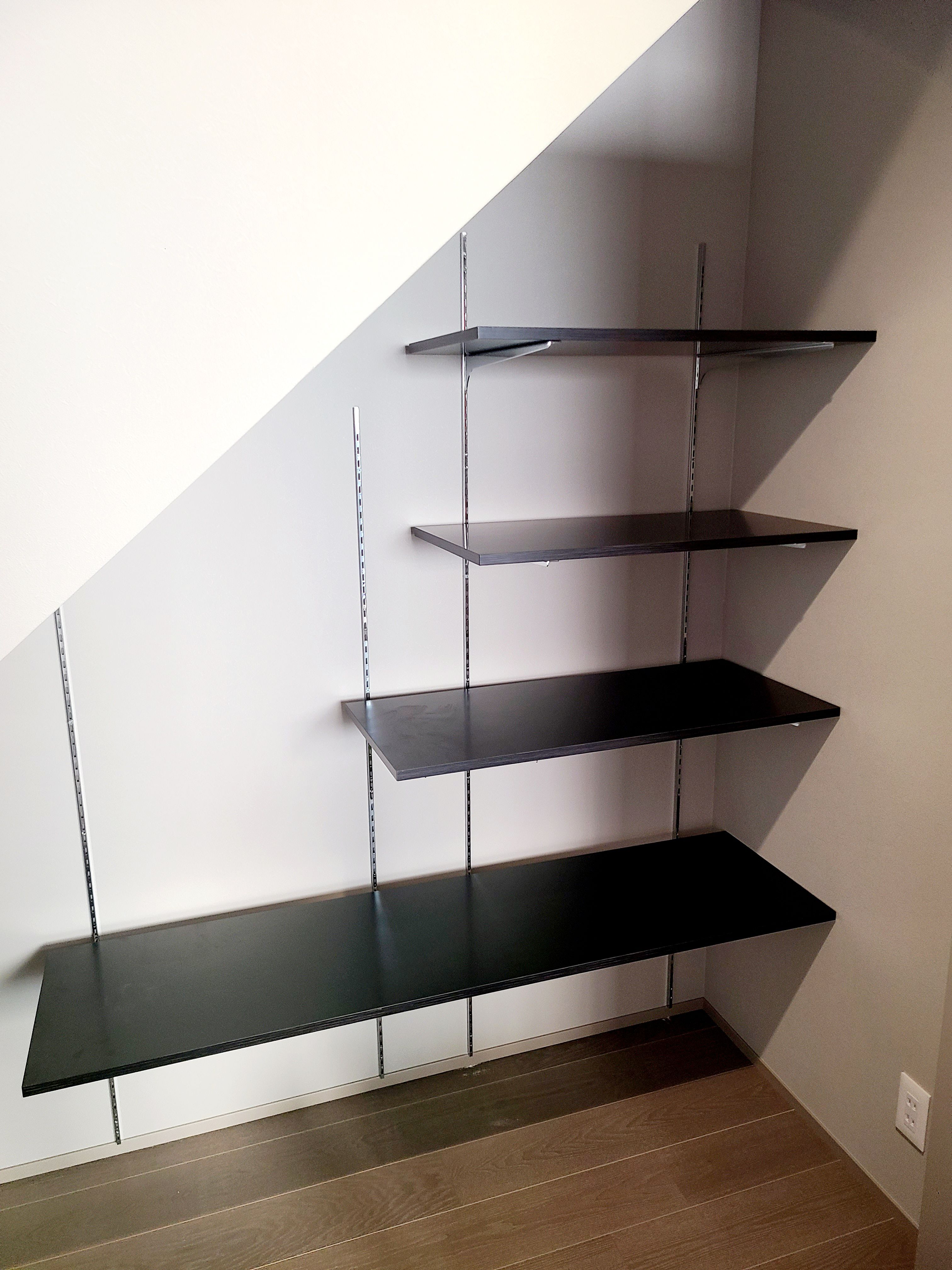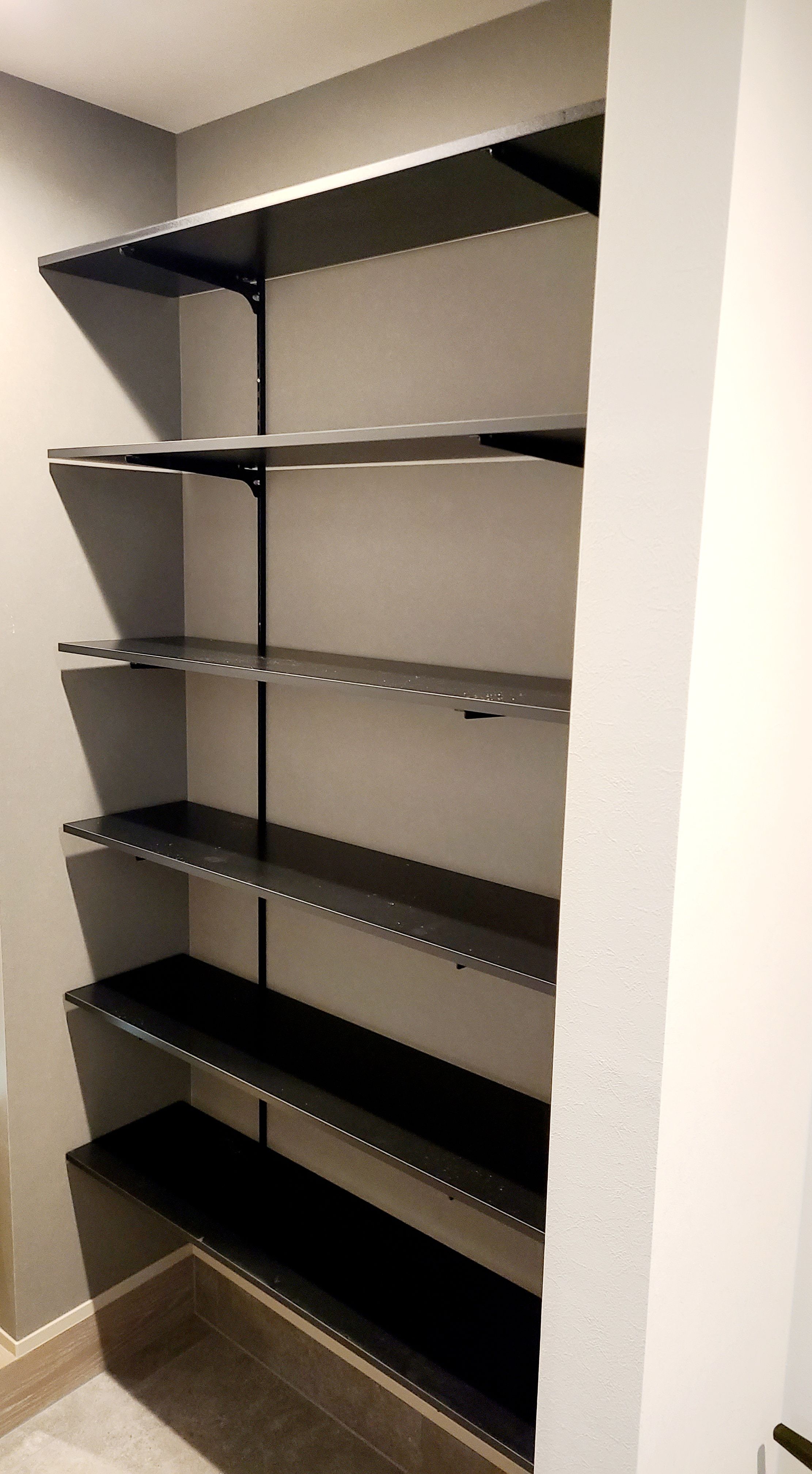 玄関に靴がたくさん置ける棚を取り付けました。階段下のスペースにも収納がたくさん置ける様に棚を設置しました。