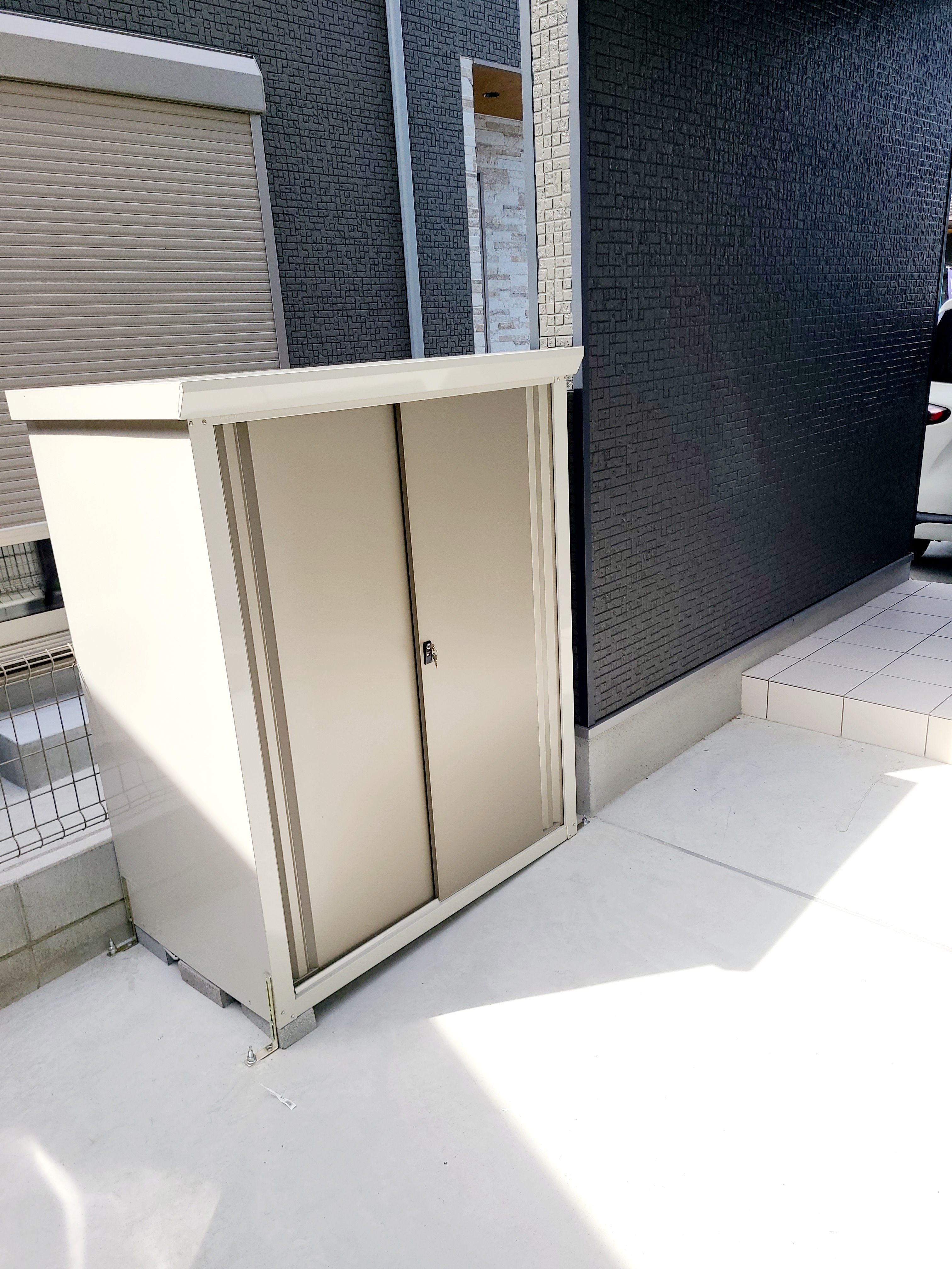 置く場所はコンクリートでしたが水が流れるように少し傾いていて物置を水平にして動かないようにアンカーで固定して組み立てました。