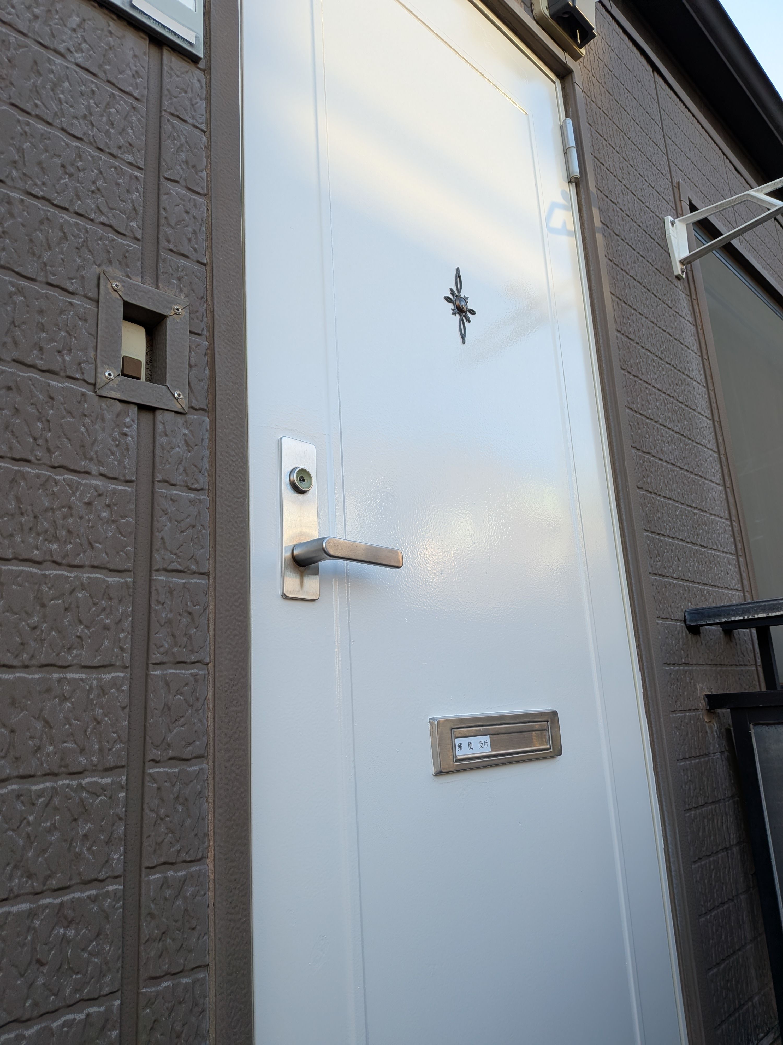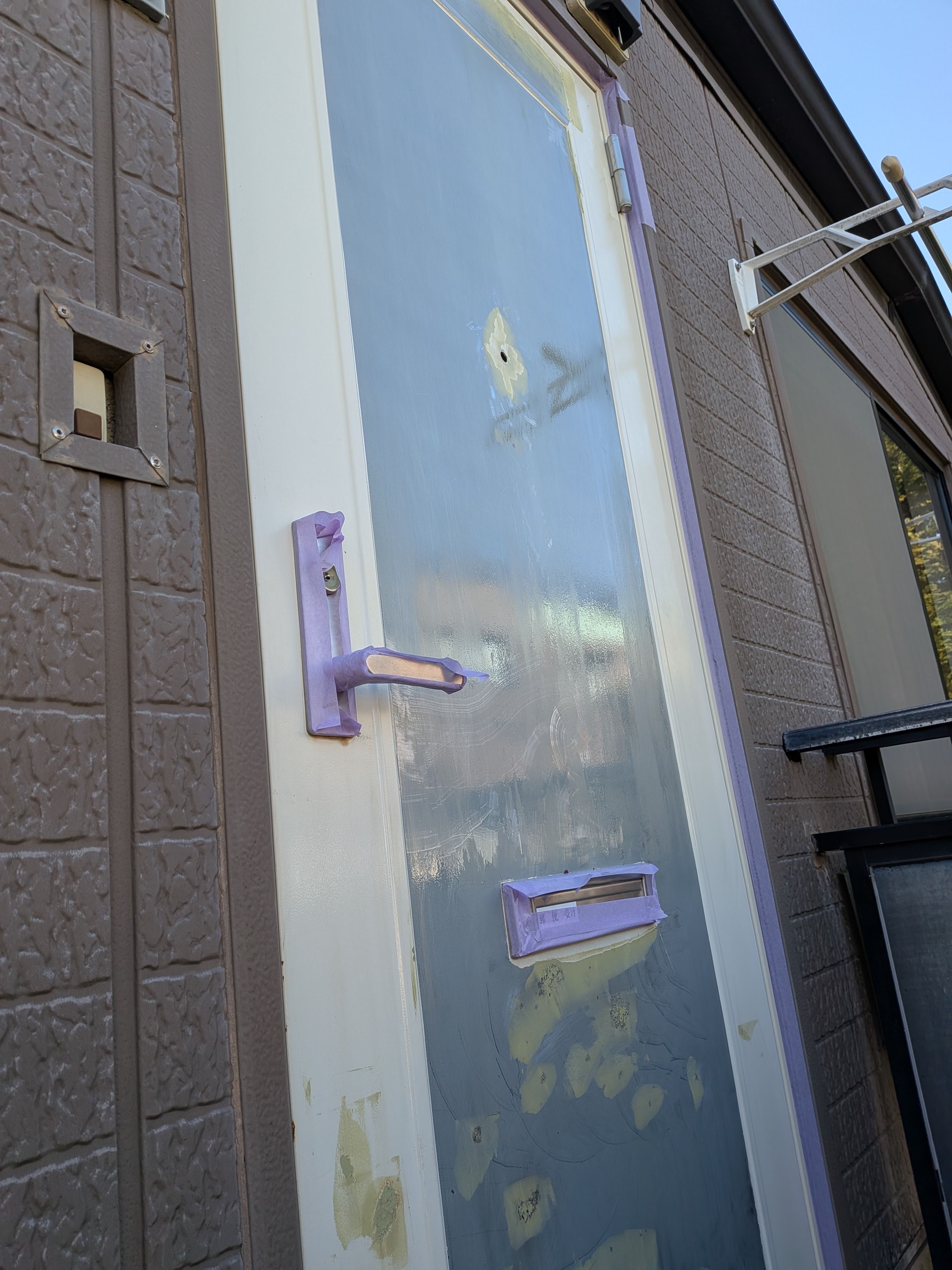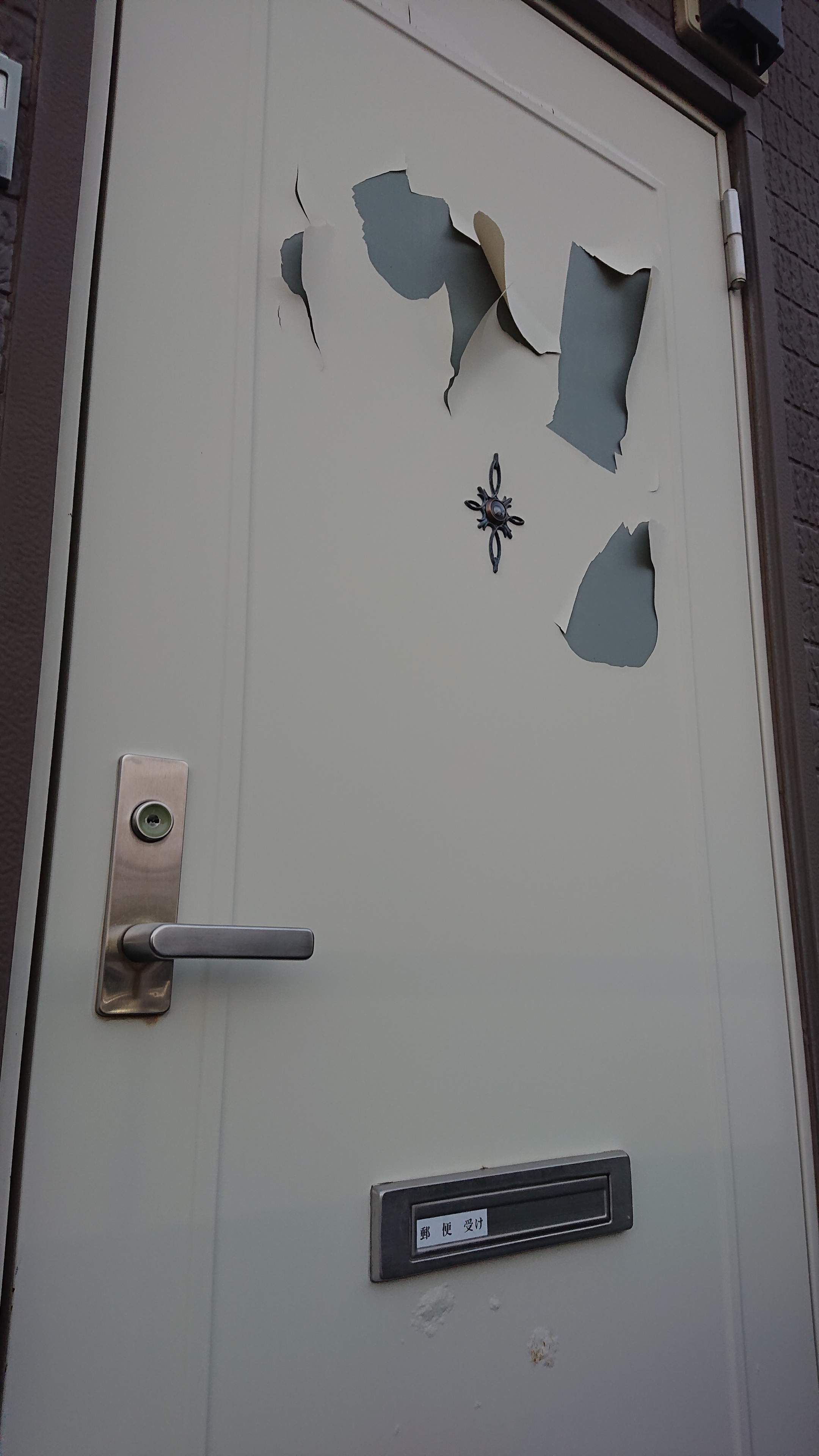 おそらくダイノックシートだと思われますが、ちょうど目線付近が剥がれてしまい、ドアはどこか気まずそうな顔をしていました。