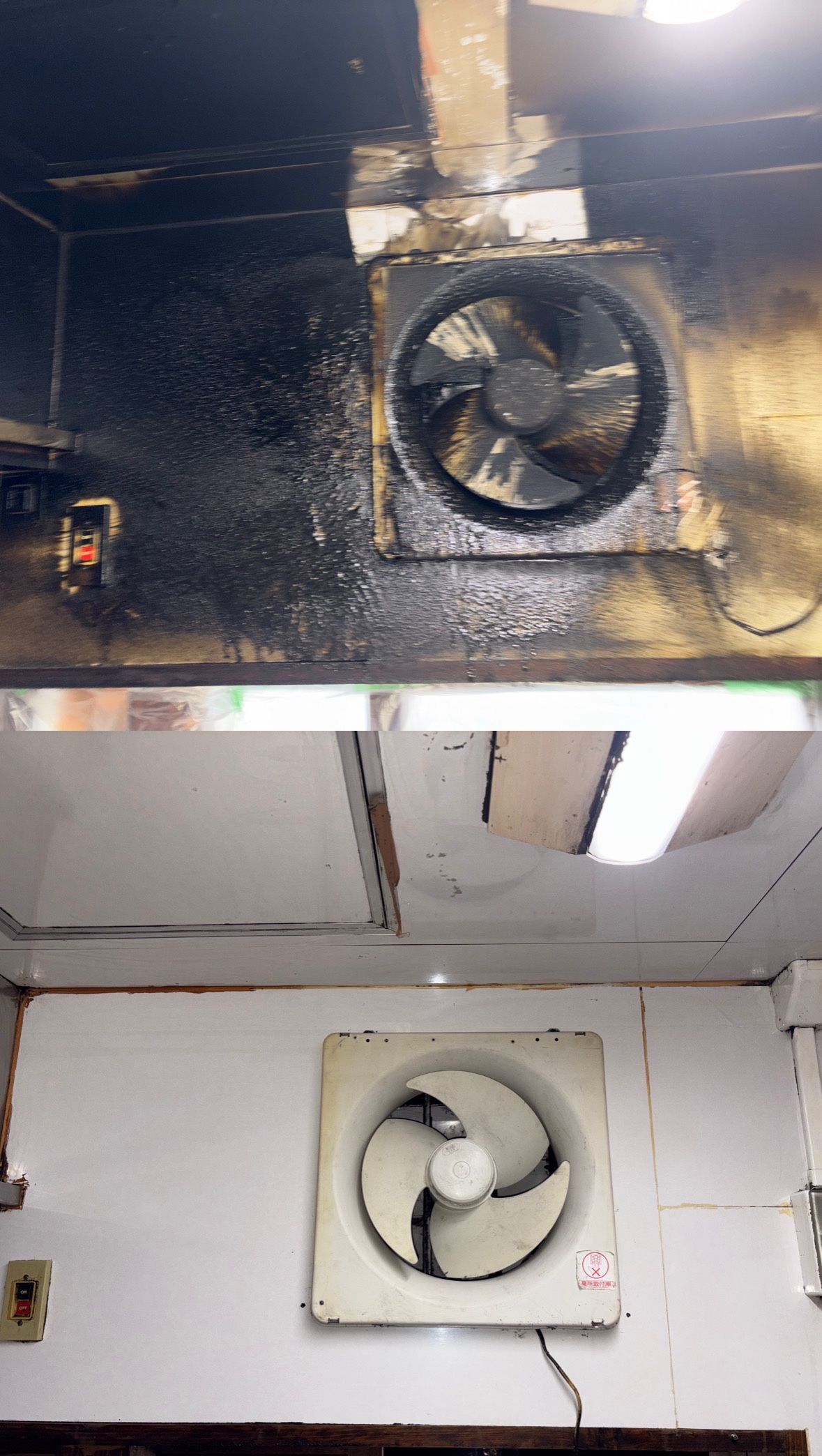 焼き鳥屋さんのフード2つ、換気扇1つ、天井の清掃を施工しました。