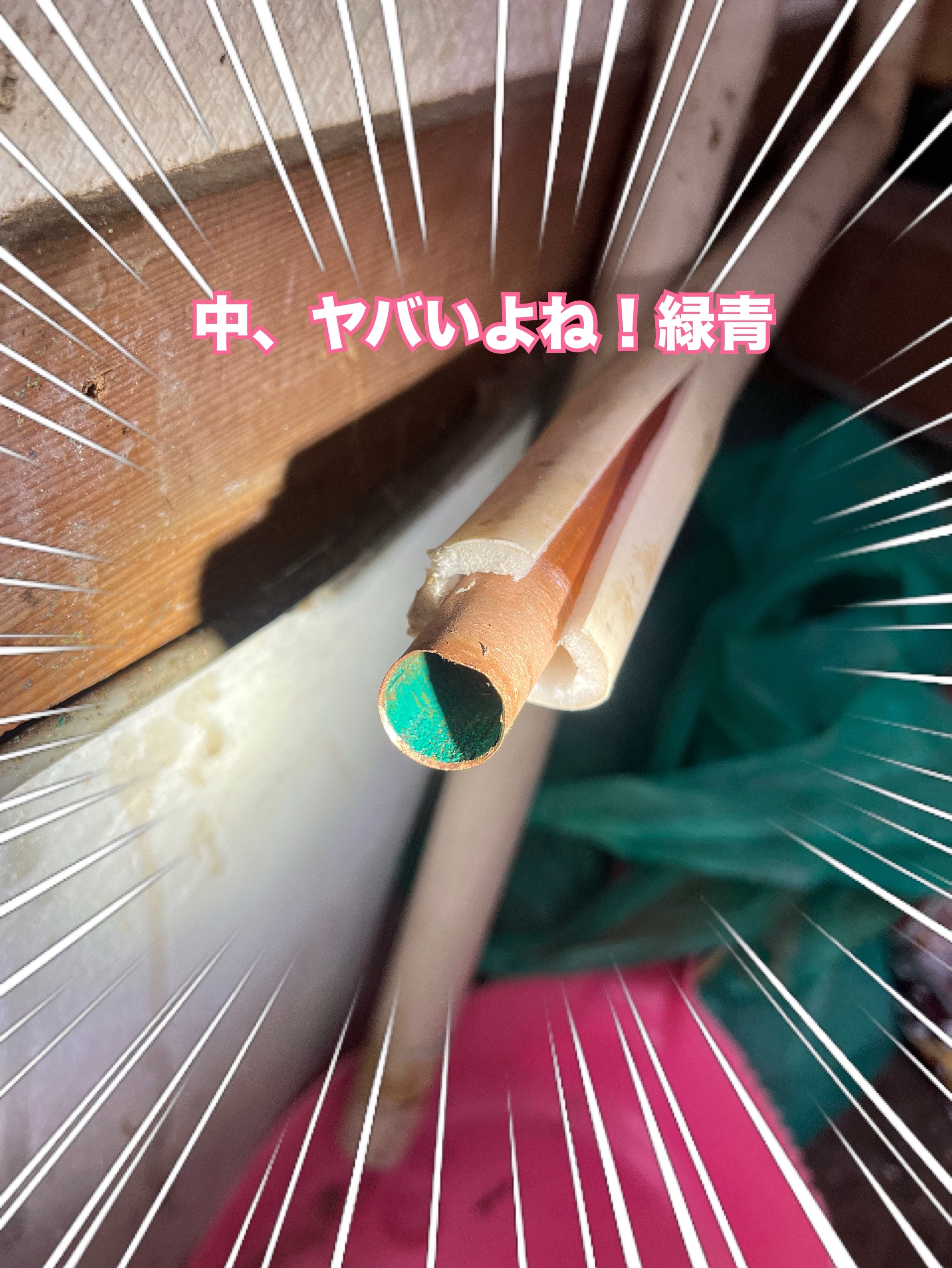 凹みます。しかも銅管内、緑青すごい!