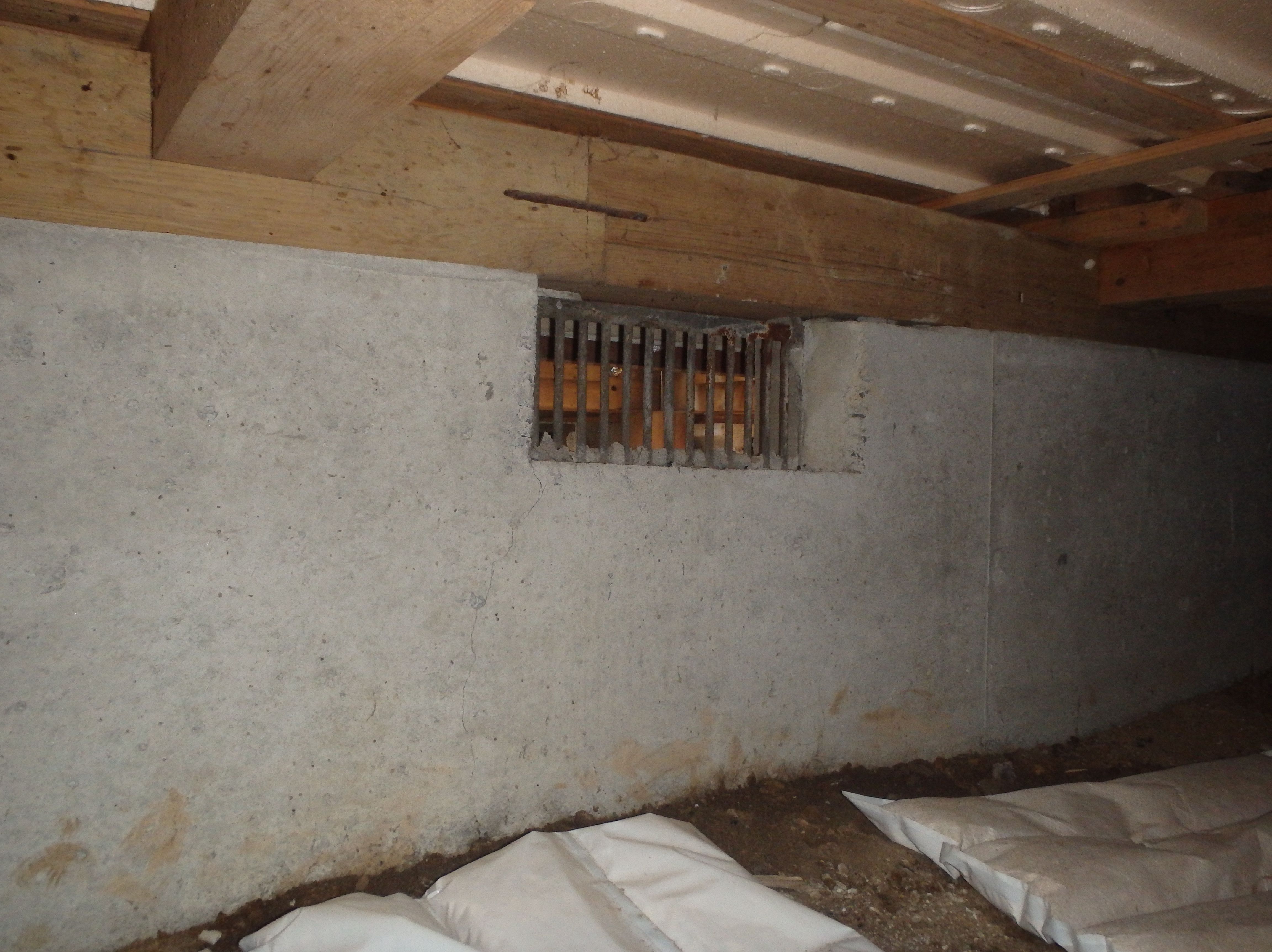 基礎の換気口周辺に複数のひび割れを確認。
