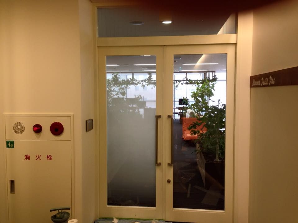 オフィス出入り口の目隠しをご希望されており、一部外が見えるようにしたいとのご要望でしたので3Mのグラデーションフィルムをご提案・施工させて頂きました。中央は目隠し上下は透明度が増える形に仕上げました。