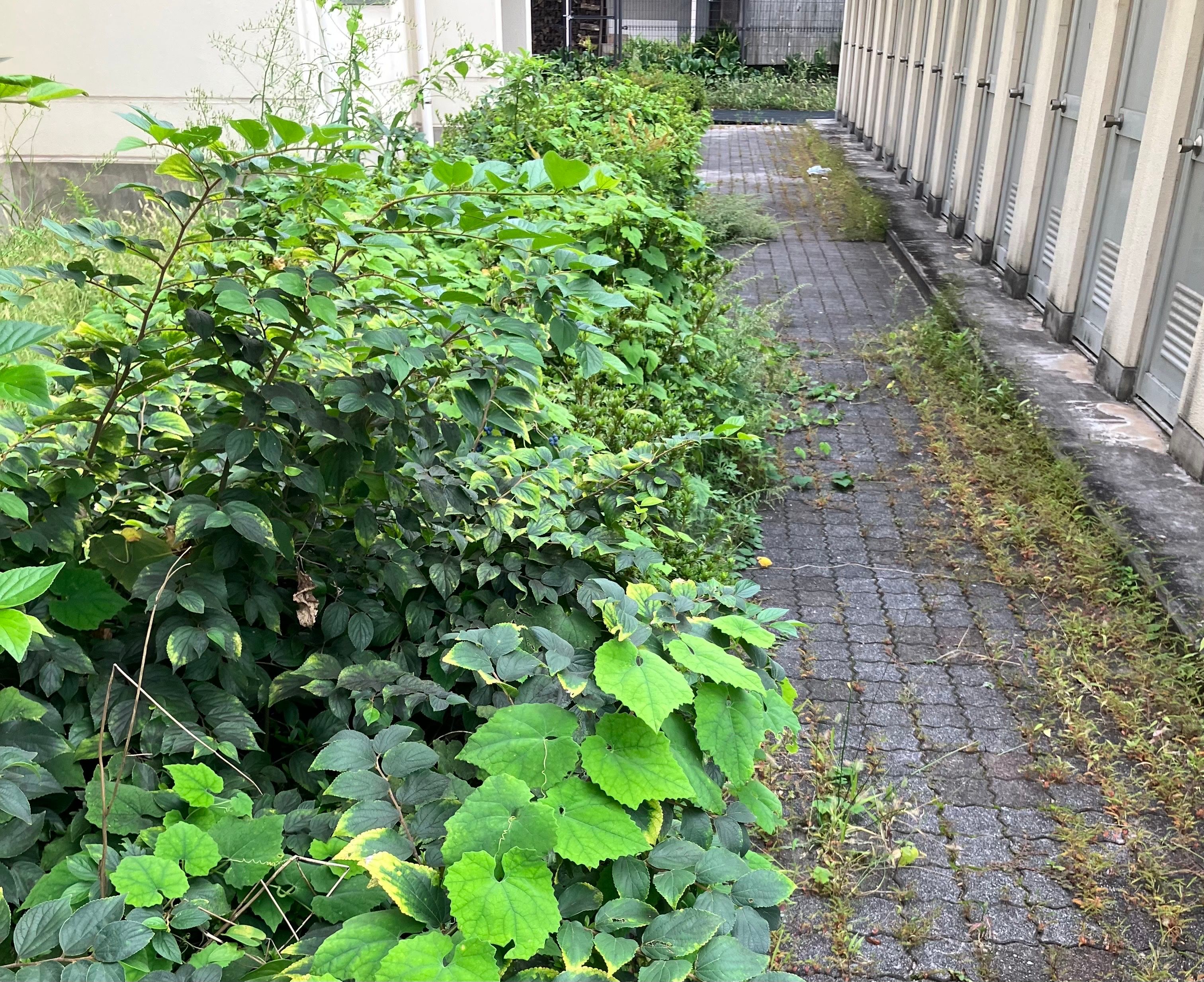 作業前は人が通れないほど枝葉が伸び放題でしたが、丁寧に刈り込みを進めて、すっきりとした通路に仕上がりました。