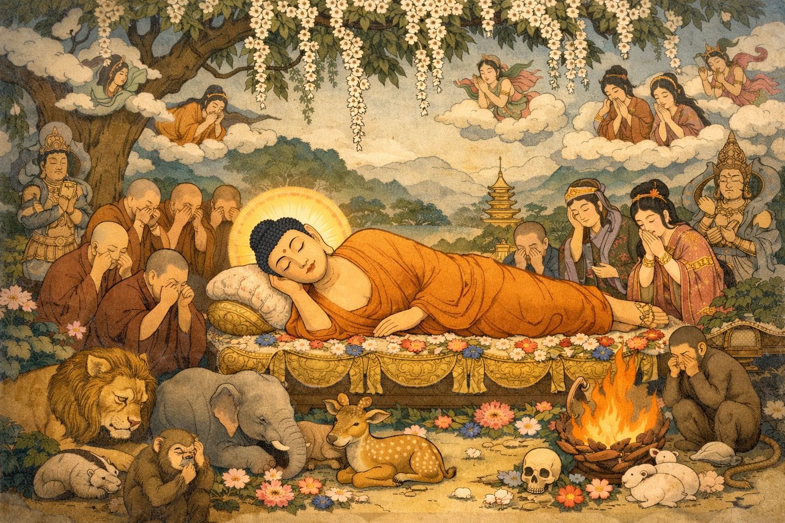 天、神、僧、動物が集い最後を偲んでいます。