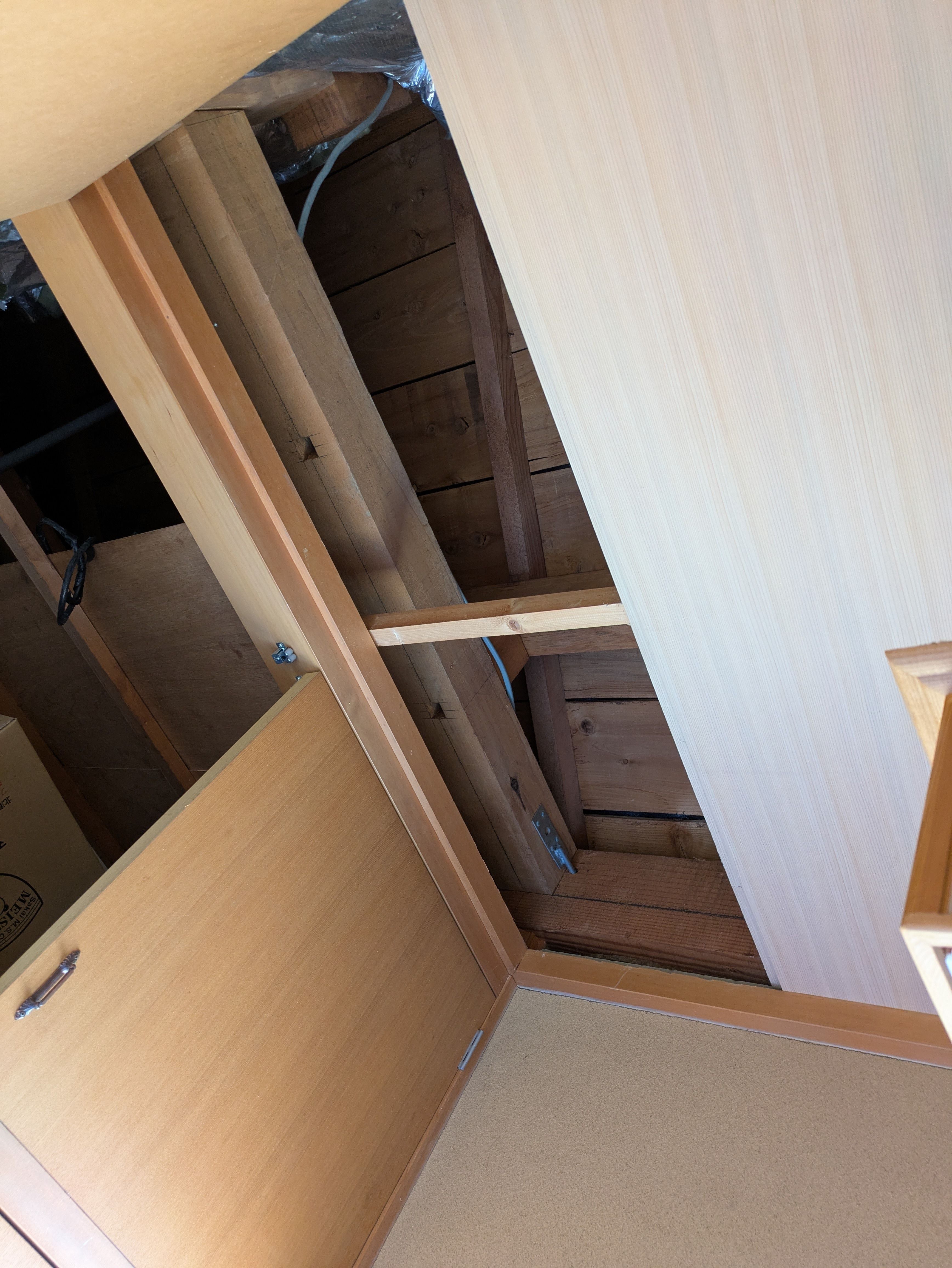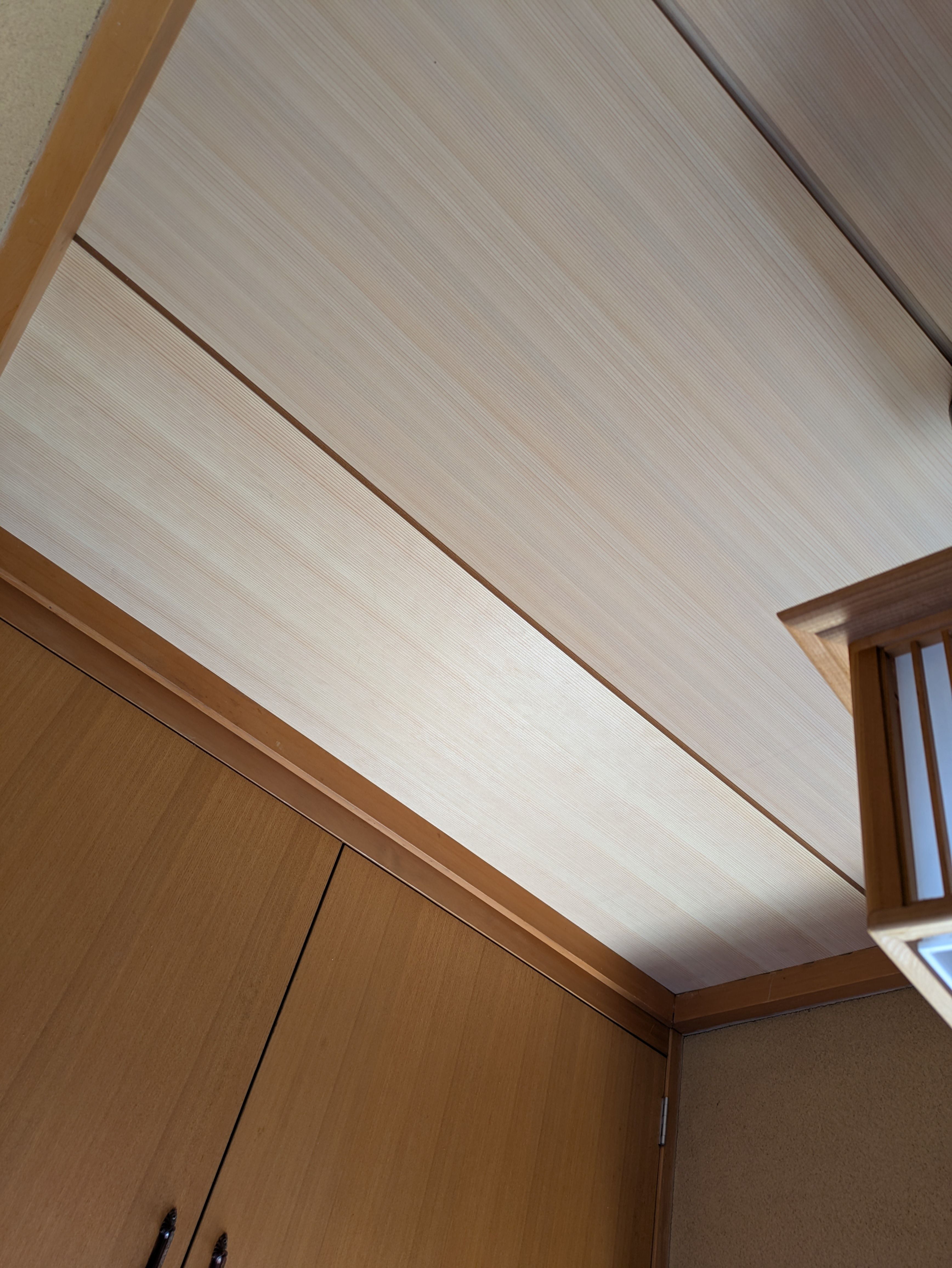 小さな部屋で天井材は4枚でしたので、全面張替えをオススメしました。(経年による色合いの違いがあるので)