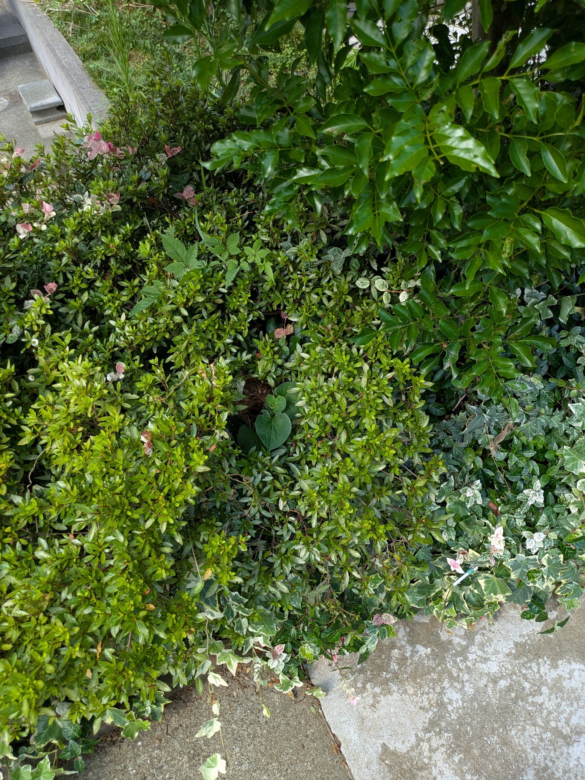 植え込みの中にいたのはコガタスズメバチの巣でした。