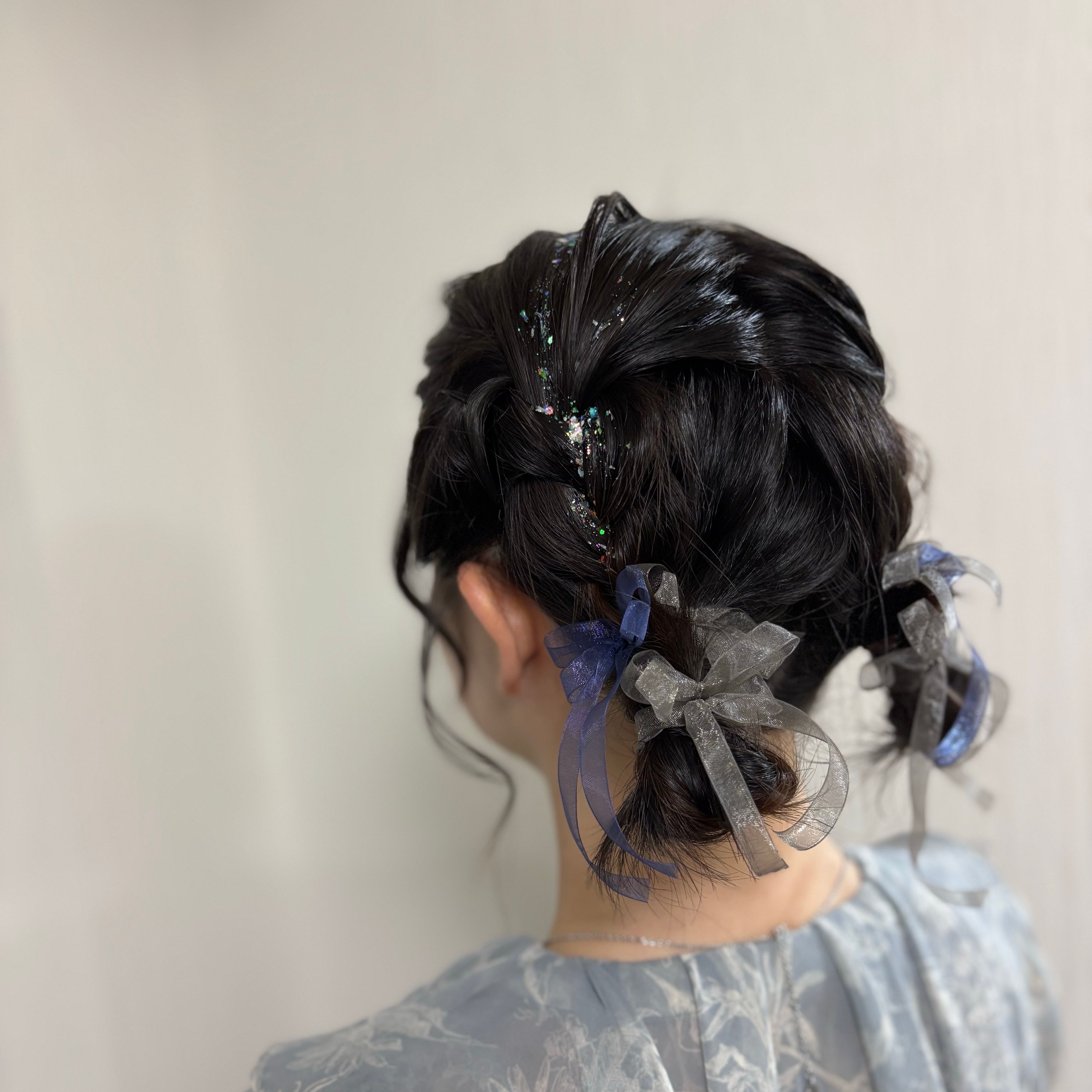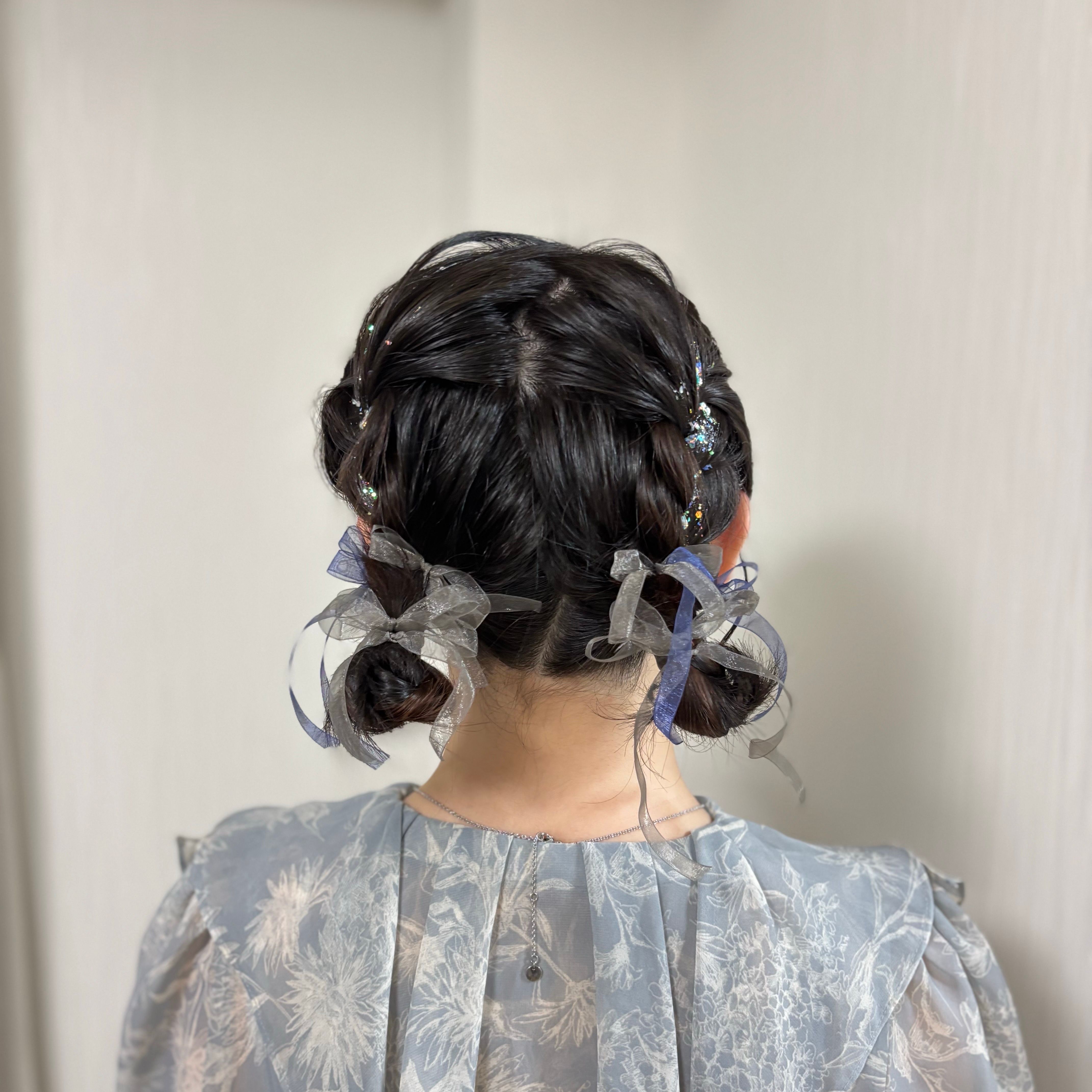 ギリギリ方につくくらいの長さでもアレンジできます。ワンピースの雰囲気に合わせてリボンやラメをつけさせていただきました。土日祝のヘアセット、メイクのご予約はお早めに。お問い合わせお待ちしております。