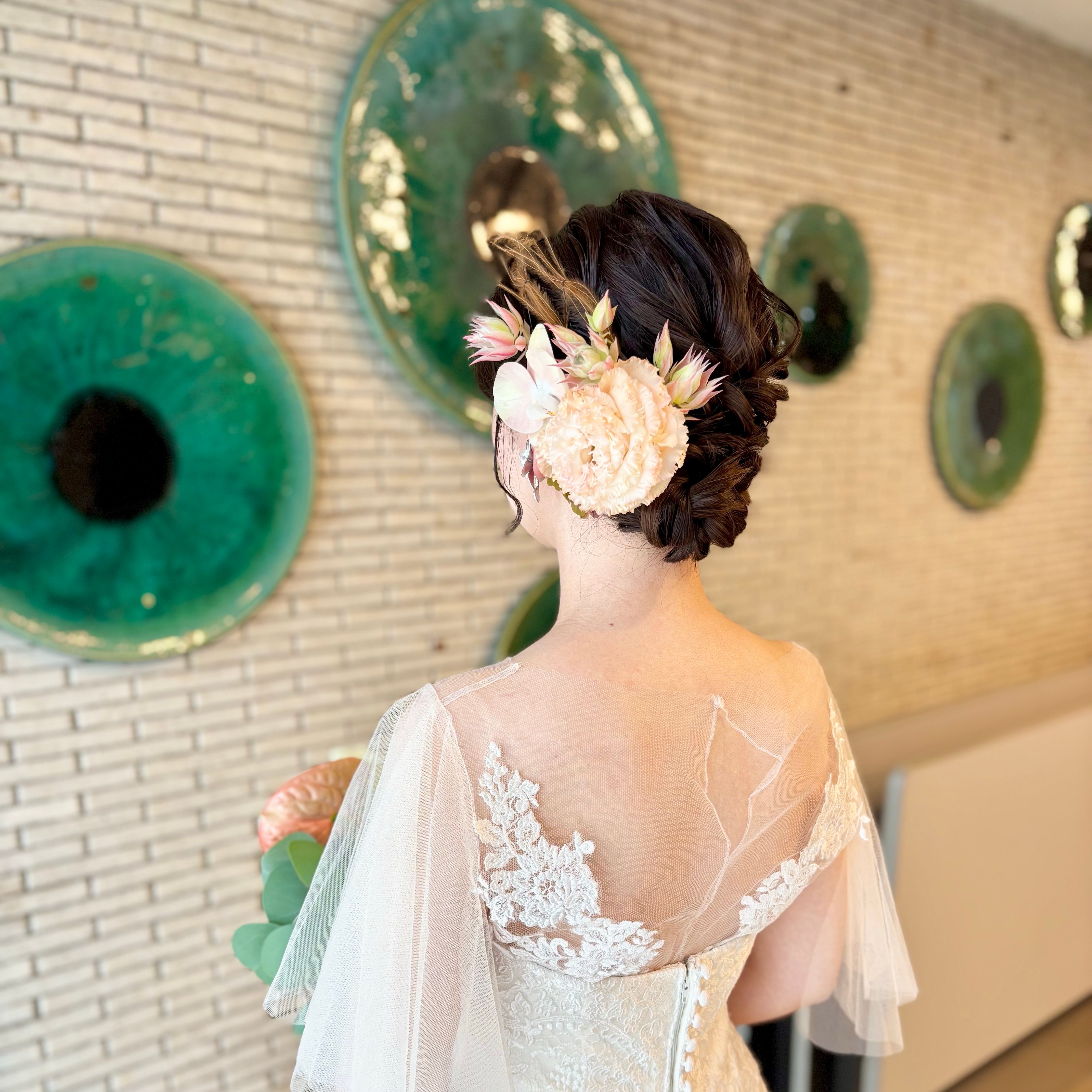 シニヨンの生花アレンジ。ピンク系のツヤ肌メイクもお似合いでした。普段はピンク系に挑戦した事がない方でも、お肌の色味や雰囲気に合わせるとワントーン明るく仕上がるのでオススメです。