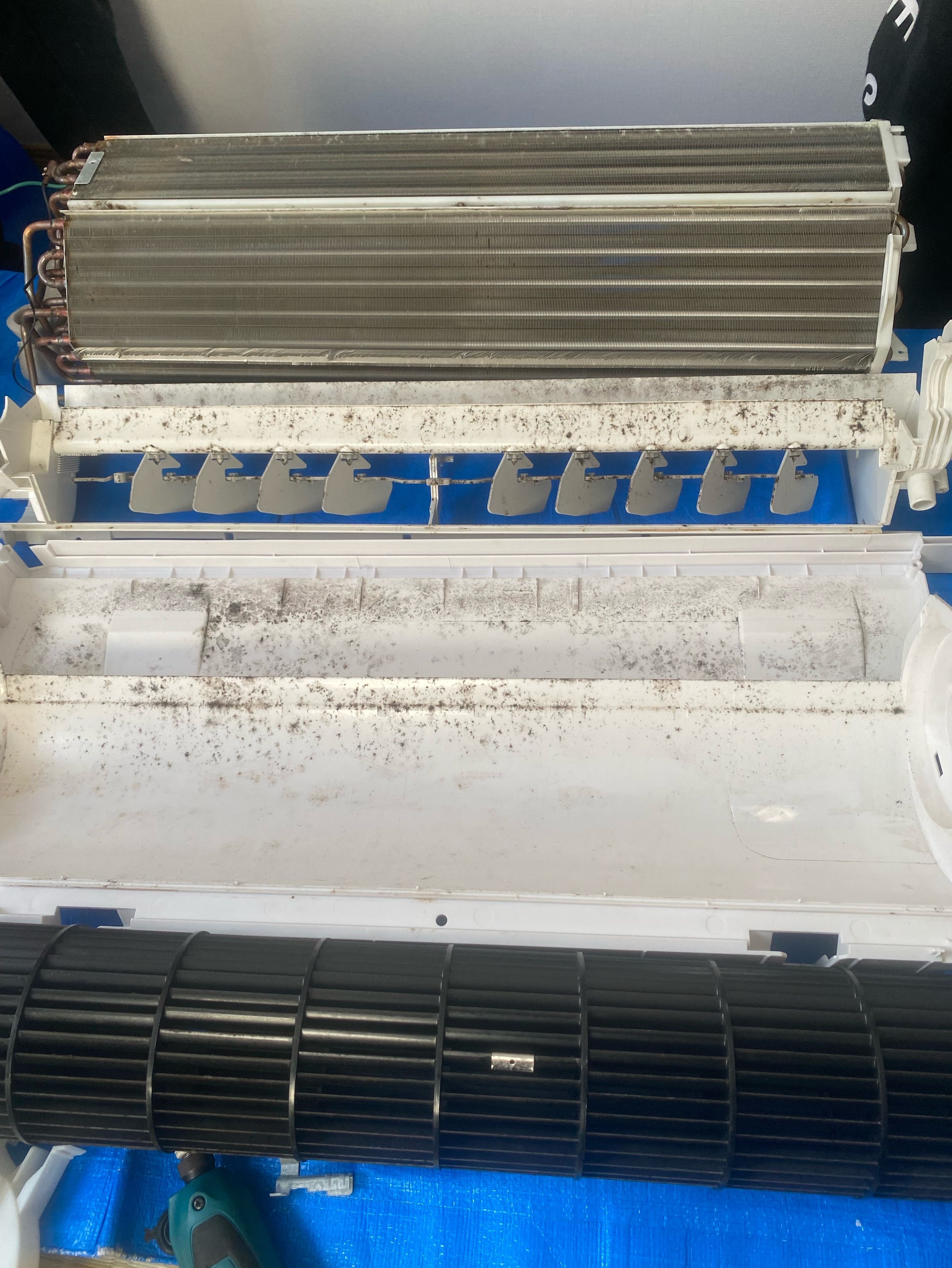 当店の送風ファン・ドレンパン取り外しについては、壁掛けから取り外し完全分解洗浄をした後に、壁掛けに取り付ける脱着分解洗浄となります。