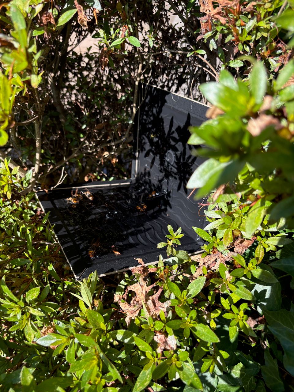 作業は日中でしたが、巣の出入口に粘着トラップを設置して働きバチの動きを抑えつつ、