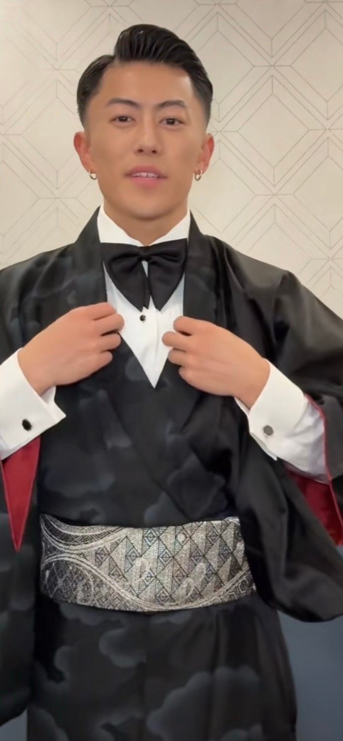 着物に蝶ネクタイという斬新なスタイル。そして流石のこの動き!着崩れない着付けを目指しました!