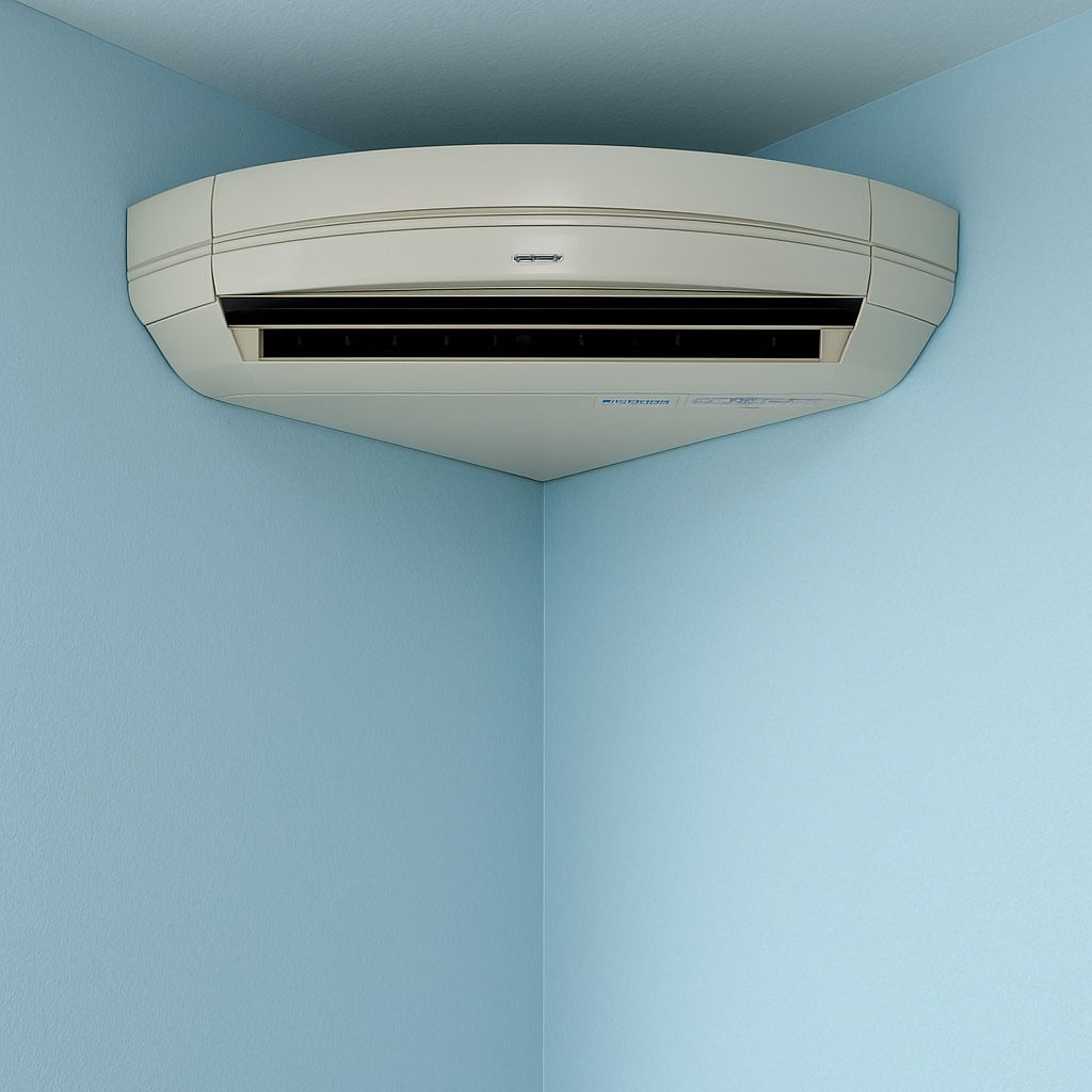 お部屋の角に設置された【コーナー型エアコン】です。