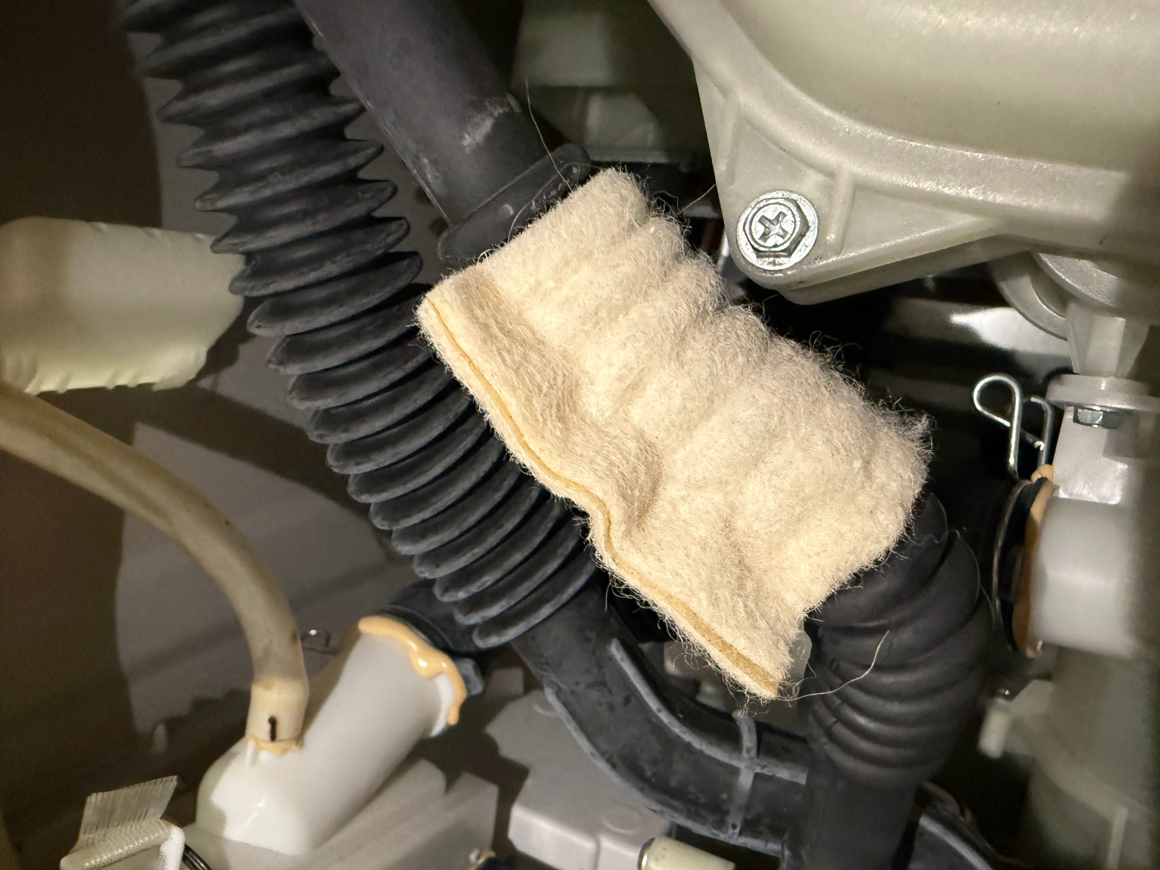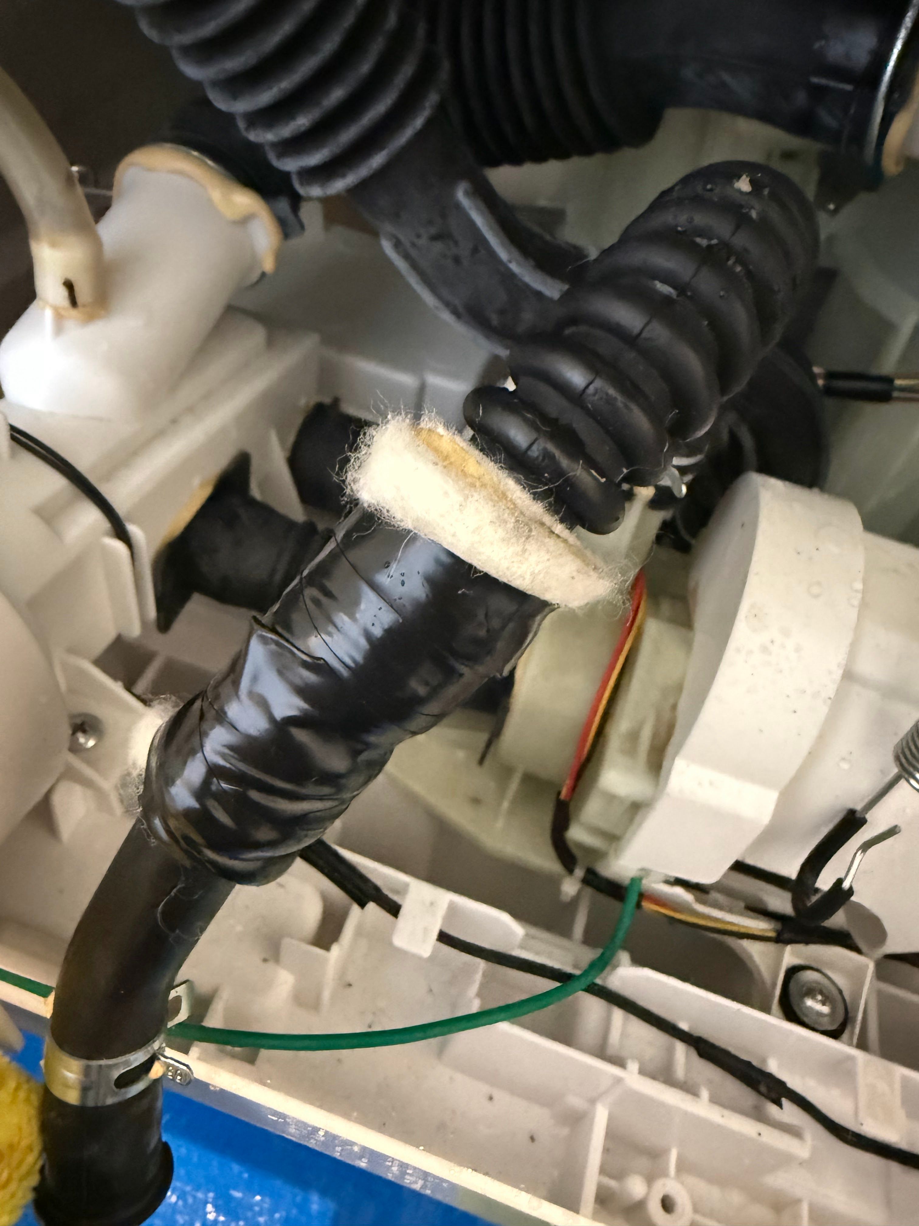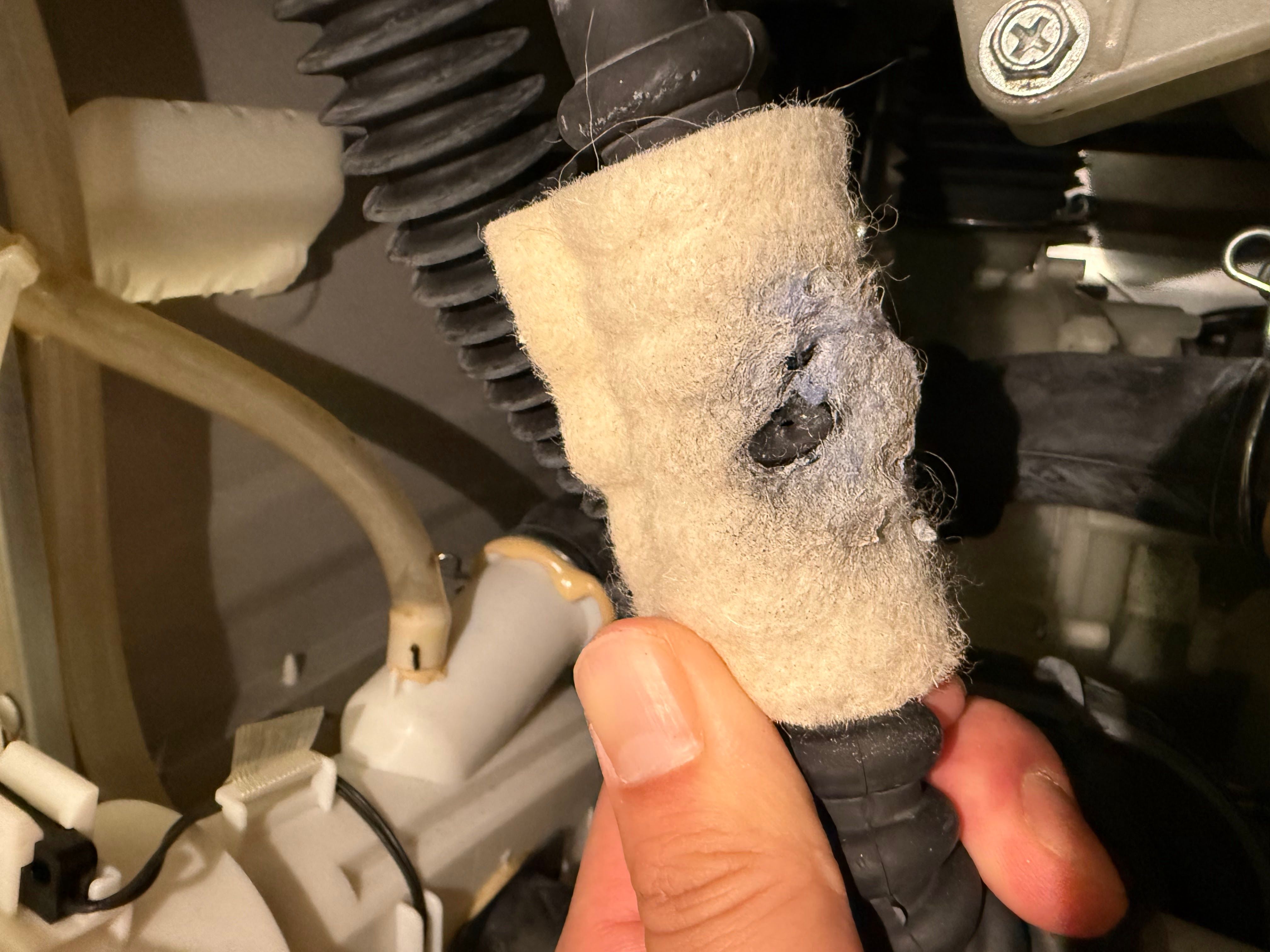 ところが、長年使っていると 排水ホースが近くのパーツに触れて擦れてしまう ことがあります。