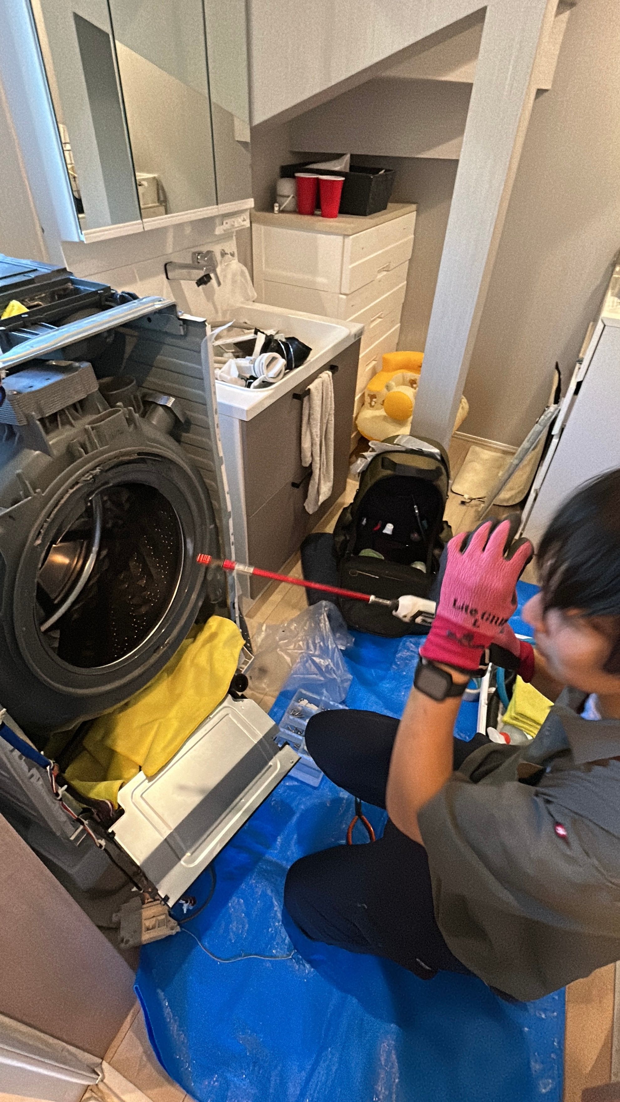 くらしのマーケットで、ドラム式洗濯機の分解洗浄を行っている「しろまるジャパン」従業員の村田です。