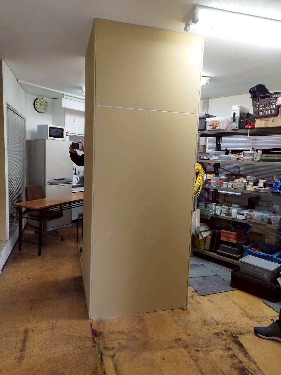 実際の現場では練習する機会が限られているため、倉庫内の一角を活用し、軽量下地とプラスターボードを使ったパテ練習用の壁を新設しています。現場と同じ環境で練習できるため、技術向上に役立つスペースになります。